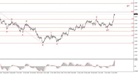 Волновая картина инструмента GBP/USD приобрела более понятный вид. В данное время продолжается построение предполагаемой волны 5 в 5, но внутренняя волновая структура глобальной волны 5 может принять гораздо более протяженный вид. Я считаю, что повышение котировок в ближайшее время будет продолжено с целями, находящимися около отметок 1,3721 и 1,3913, что соответствует 100,0% и 127,2% по Фибоначчи. После завершения текущего пятиволнового набора инструмент может построить три коррекционные волны. Но на данный момент повышательный участок еще не завершен, а после коррекции я жду новый импульсный участок тренда в направлении 42-й фигуры.Основные принципы моего анализа: