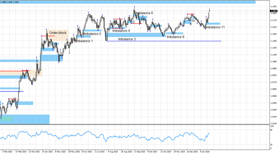 Безусловно, благодарить за очередное падение доллара следует Дональда Трампа. На экономические отчеты в течение прошлой недели трейдеры не обращали никакого внимания. Апофеозом игнора стала публикация отчета по ВВП за третий квартал США, который показал более сильное значение, чем ожидалось. Дональд Трамп сначала ввел торговые тарифы для стран ЕС, потом отменил их, но трейдеры в обоих этих событиях увидели только негатив. И, на мой взгляд, они абсолютно верно разобрались в сложившейся ситуации, так как подобная чехарда обозначает только одно – решения президента США (на секундочку страны с крупнейшей экономикой в мире) не стоят ничего. Сегодня Трамп может ввести пошлины, завтра отменить их. Сегодня Трамп может заявить о готовности захватить Гренландию силовым методом, а на завтра – передумать. Сегодня Трамп имеет претензии в Европе, завтра – к Китаю, послезавтра – к Канаде. Рынки не могут понять, чего ожидать от Трампа и отрабатывают наихудший сценарий. Поэтому предпочитают при удобной возможности избавляться от американской валюты. На текущий момент продажи доллара не носят массовый характер, но у нас есть новый сигнал, и я ожидаю нового роста пары. Графическая картина продолжает сигнализировать о «бычьей» доминации, но в долгосрочном плане. «Бычий» тренд сохраняется, несмотря на горизонтальное движение в последние месяцы. Был образован новый «бычий» сигнал в имбалансе 11, который позволяет ожидать рост минимум к 1,1976 (нижняя граница недельного имбаланса). А уже сегодня может быть образован еще один «бычий» имбаланс, от которого в дальнейшем вновь можно будет открывать сделки на покупку. Информационный фон в понедельник дал трейдерам новую пищу для размышлений. Дональд Трамп пригрозил ввести против Канады пошлины на 100%, если та продолжит свободную торговлю с Китаем. Как видим, в заголовке «Трамп атакует» можно каждую неделю подставлять лишь нужное название страны, а общий смысл остается прежним. В понедельник доллар избежал падения, но еще не вечер. Причин у быков для нового наступления имеется в достатке уже месяцев 4-5, и с каждым новым днем их становится только больше. Это и «голубиные» (в любом случае) перспективы ДКП FOMC, это и общая политика Дональда Трампа (которая не поменялась за последнее время), это и противостояние США с Китаем (где наступило лишь временное перемирие), это и акции протеста американского народа против Трампа под эгидой «No kings», это и слабость рынка труда, это и не радужные перспективы американской экономики (рецессия), это и «шатдаун» (который длился полтора месяца, но явно не был учтен трейдерами). А теперь это еще и военная агрессия США по отношению к некоторым государствам, уголовное преследование Пауэлла и «гренландская неразбериха». Таким образом, дальнейший рост пары, на мой взгляд, будет полностью закономерным. В «медвежий» тренд я по-прежнему не верю. Информационный фон по-прежнему крайне сложно интерпретировать в пользу доллара, поэтому я и не пытаюсь это делать. Синяя линия показывает ценовой уровень, ниже которого можно будет считать «бычий» тренд завершенным. До него медведям нужно пройти вниз около 460 пипсов, и я считаю эту задачу невыполнимой при текущем информационном фоне и в текущих обстоятельствах. Ближайшей целью для роста европейской валюты остается «медвежий» имбаланс 1,1976 –