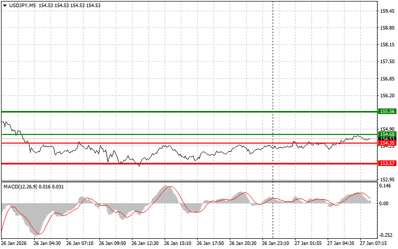Разбор сделок и советы по торговле японской иенойТест цены 153.98 совпал с моментом, когда индикатор MACD только начинал движение вверх от нулевой отметки, что стало подтверждением правильной точки входа на покупку доллара. В результате пара выросла на 25 пунктов. Разговоры о том, что США могут помочь Японии поддержать иену, сказались на паре USD/JPY, которая вчера почти весь день оставалась под давлением. Возможность интервенции со стороны США или скоординированных действий с Банком Японии рассматривается как потенциальный инструмент для стабилизации иены. Однако, учитывая текущую экономическую ситуацию в США, с ее собственной инфляцией и необходимостью сдерживания экономического роста, участие в поддержке иены может оказаться непростым решением. Но следует понимать, что пока это все разговора, так как любая интервенция должна быть тщательно взвешена с учетом ее потенциального влияния на американскую экономику и валютную политику. Ситуация вокруг иены и возможности ее поддержки со стороны США представляется сложным балансом экономических и политических факторов. Рынок будет чутко реагировать на любые сигналы от американских и японских властей. Неопределенность в отношении дальнейших действий как Банка Японии, так и Федеральной резервной системы будет продолжать оказывать влияние на курс иены и доллара США.Что касается внутридневной стратегии, то больше буду опираться на реализацию сценариев №1 №2.Сценарии на покупкуСценарий №1: покупать USD/JPY сегодня планирую при достижении точки входа в районе 154.68 (зеленая линия на графике) с целью роста к уровню 154.96 (более толстая зеленая линия на графике). В районе 155.56 собираюсь выходить из покупок и открывать продажи в обратную сторону (расчет на движение в 30-35 пунктов в обратную сторону от уровня). К покупкам пары лучше всего возвращаться на коррекциях и серьезных просадках USD/JPY. Важно! Перед покупкой, убедитесь в том, что индикатор MACD находится выше нулевой отметки и только начинает свой рост от нее.Сценарий №2: покупать USD/JPY сегодня также планирую в случае двух подряд тестов цены 154.35 в момент, когда индикатор MACD будет находиться в области перепроданности. Это ограничит нисходящий потенциал пары и приведет к обратному развороту рынка вверх. Можно ожидать рост к противоположным уровням 154.68 и 155.56.Сценарии на продажу Сценарий №1: продавать USD/JPY сегодня планирую лишь после обновления уровня 154.35 (красная линия на графике), что приведет к быстрому снижению пары. Ключевой целью продавцов будет уровень 153.57, где собираюсь выходить из продаж, а также открывать сразу покупки в обратную сторону (расчет на движение в 20-25 пунктов в обратную сторону от уровня). Продавать лучше, как можно выше. Важно! Перед продажей, убедитесь в том, что индикатор MACD находится ниже нулевой отметки и только начинает свое снижение от нее. Сценарий №2: продавать USD/JPY сегодня также планирую в случае двух подряд тестов цены 154.68 в момент, когда индикатор MACD будет находиться в области перекупленности. Это ограничит восходящий потенциал пары и приведет к обратному развороту рынка вниз. Можно ожидать снижения к противоположному уровню 154.35 и 153.57.Что на графике: Тонкая зеленая линия – цена входа, по которой можно покупать торговый инструмент. Толстая зеленая линия – предположительная цена, где можно расставлять Take profit или сам