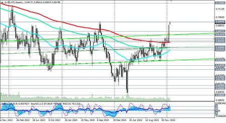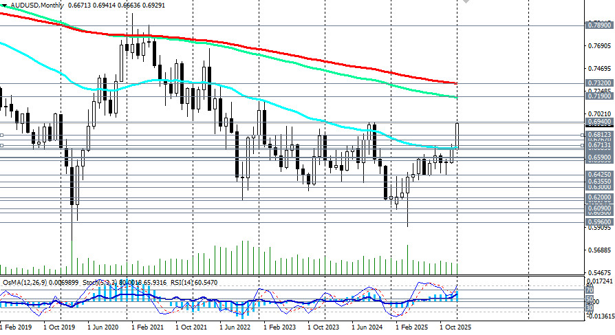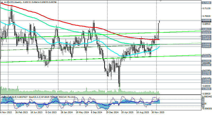 Пока готовилась данная статья, цена пробила вчерашний максимум на уровне 0.6940 и достигла нового рекорда с сентября 2024 года вблизи 0.6950. AUD/USD демонстрирует сильный восходящий импульс, поддерживаемый сочетанием слабого доллара США и ожиданий ужесточения политики РБА. Фундаментальный фон благоприятствует дальнейшему укреплению австралийского доллара: сильная внутренняя экономика требует сдерживания инфляции, в то время как доллар США страдает от политических потрясений, отметили мы в нашем сегодняшнем фундаментальном анализе и обзоре «AUD/USD: бычий импульс на фоне ослабления доллара и ожиданий ужесточения политики РБА». Ключевые уровни Сопротивление: 0.6940 – 0.6980 (верхняя граница восходящего канала на дневном графике). Его пробой откроет путь к 0.7100 – 0.7190 (ЕМА144 на месячном графике). Поддержка: 0.6860 (нижняя граница восходящего канала) – 0.6812 (ЕМА200 на 1-часовом графике). Более отдаленная и среднесрочная – 0.6685 (EMA 50 на дневном графике). Основной сценарий При сохранении слабости доллара США и подтверждении устойчиво высокой инфляции в Австралии пара AUD/USD может продолжить рост в направлении 0.7000 – 0.7100, сохранять бычий уклон при коррекциях к поддержке. Дальнейший рост и пробой стратегических уровней сопротивления 0.7190, 0.7300, 0.7320 (ЕМА200 на месячном графике) выведет цену в зону глобального бычьего рынка, открыв цене дорогу в сторону локальных уровней сопротивления 0.7900, 0.8000 (максимумы 2021 года), 0.8100 (максимумы 2018 года). Первым сигналом для начала реализации данного сценария может стать пробой отметки 0.6950, а затем 0.6980. Однако, стоит обратить внимание на предупреждающий сигнал: RSI на дневном и недельном графиках находится в зоне перекупленности (около 80), что указывает на растянутость текущего ралли и высокую вероятность технической коррекции или консолидации перед новым рывком. Поэтому, если данные по CPI окажутся слабее ожиданий, ФРС сохранит жёсткую риторику, усилится спрос на доллар как защитный актив, пара может перейти в фазу коррекции с целями 0.6850 – 0.6800. Более глубокая коррекция подразумевает снижение к зоне поддержки вокруг уровней 0.6713 (ЕМА200 на 4-часовом графике), 0.6685 (EMA 50 на дневном графике). Пробой ключевой поддержки на уровне 0.6670 (ЕМА200 на недельном графике) вернет цену в зону долгосрочного медвежьего рынка с целями снижения на ключевых уровнях поддержки 0.6590 (ЕМА144 на дневном графике), 0.6565 (ЕМА200 на дневном графике). Их пробой, в свою очередь, окончательно переломит среднесрочный бычий тренд, вернув AUD/USD также и в зону долгосрочного медвежьего рынка. Самым ранним сигналом для реализации данного альтернативного сценария может стать пробой сегодняшнего минимума и ЕМА200 на 15-минутном графике 0.6902. Уровни поддержки: 0.6902, 0.6900, 0.6812, 0.6800, 0.6767, 0.6713, 0.6700, 0.6685, 0.6670, 0.6600, 0.6590, 0.6565, 0.6500 Уровни сопротивления: 0.6940, 0.6950, 0.6980, 0.7000, 0.7100, 0.7190, 0.7200, 0.7300, 0.7320, 0.7890, 0.7900, 0.8000, 0.8100 Торговые сценарии