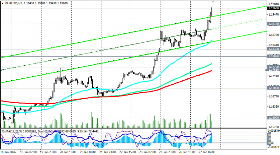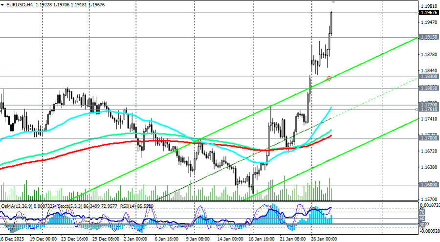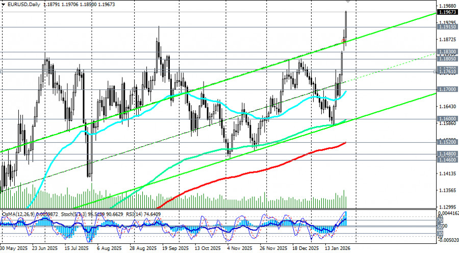 EUR/USD находится в фазе устойчивого восходящего тренда, оставаясь одной из самых сильных валютных пар на рынке. Слабость доллара США, политические и торговые риски, а также сбалансированная позиция ЕЦБ формируют устойчивую поддержку евро. Тренд по EUR/USD остаётся бычьим, пока внимание рынка сосредоточено на решениях ФРС и политике США. Среднесрочные перспективы пары выглядят позитивно при сохранении текущего фона, отметили мы в нашем сегодняшнем фундаментальном анализе и обзоре «EUR/USD: сохраняя позитивную динамику».Пока готовилась эта статья, цена поднялась к новому внутридневному максимуму и максимуму с июля 2021 года на уровне 1.1970. Как фундаментальный, так и технический фон создают предпосылки для дальнейшего роста цены. Перспективы EUR/USD остаются позитивными, а предпочтительными - длинные позиции. Самым первым сигналом для их наращивания может стать пробой сегодняшнего максимума 1.1970, а ближайшими целями - локальные уровни сопротивления 1.2000, 1.2020 (верхняя граница восходящего канала на недельном графике). Следующими целями основного сценария (при сохранении политической неопределённости в США, торговых рисков, мягких ожиданий по политике ФРС) пара EUR/USD может продолжить рост с движением в сторону 1.2100 - 1.2250 (максимумы июня 2021 года). В альтернативном сценарии (в случае неожиданно жёсткой риторики ФРС, снижения рисков шатдауна, восстановления спроса на доллар как защитный актив) возможна коррекция. Первым сигналом для начала его реализации может стать пробой локального уровня поддержки 1.1915 и «круглой» отметки 1.1900. Целью коррекции, не нарушающей среднесрочный восходящий тренд, могут стать уровни поддержки 1.1800 – 1.1761 (ЕМА200 на 1-часовом графике). В случае пробоя важного уровня поддержки 1.1700 (ЕМА50 на дневном графике) возможна более глубокая коррекция в рамках среднесрочного бычьего тренда к ключевым уровням поддержки 1.1600 (ЕМА144 и нижняя линия восходящего канала на дневном графике), 1.1520 (ЕМА200 на дневном графике), в зоне которых, учитывая сохраняющийся бычий тренд и рассчитывая на отбой и возобновление роста, возможно рассмотрение и расположение новых ордеров на покупку. Лишь пробой ключевых уровней поддержки 1.1480 (ЕМА50 на недельном графике), 1.1460 (ЕМА144 на месячном графике) подтвердит переход цены в зону среднесрочного и глобального медвежьего рынка, делая предпочтительными короткие позиции. Пока же предпочтительными остаются длинные. открыть торговый счет + зарегистрироваться в системе копирования сигналов + инвестировать в ПАММ-системеМатериал предоставлен компанией InstaForex - www.instaforex.com