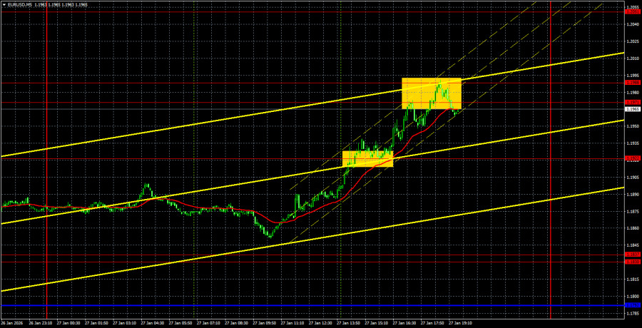 Валютная пара EUR/USD в течение вторника продолжила восходящее движение после небольшой паузы. Макроэкономический фон вчера фактически отсутствовал в Евросоюзе и США, поэтому очередное падение доллара даже теоретически нельзя связать с какими-либо отчетами. Рынок просто продолжает практически без остановки продавать доллар. И именно о таком развитии событий мы и предупреждали трейдеров. Как только семимесячный флэт завершится, возобновится тренд 2025 года. И тогда паре не нужны будут никакие локальные новости, чтобы продолжать движение на Север. А причин продавать валюту США у рынка с каждым днем становится только больше. Дональд Трамп после Гренландии переключил свое внимание на Канаду. После Канады – на Южную Корею. Когда президент США сделает полный круг по планете Земля, начнет вводить пошлины по второму кругу. Помимо этого, Трамп открыто заявляет, что хочет видеть доллар более дешевым. Что ж, если сам президент так считает, то что могут сделать трейдеры? По сути, правительство США дало добро на обесценивание национальной денежной единицы. Отрицать этот факт бессмысленно. На часовом ТФ рост пары настолько сильный, что даже линию тренда построить не получается. Волатильность существенно увеличилась, потому что флэт завершился. Все, как мы и предсказывали. На 5-минутном ТФ первый торговый сигнал на покупку вчера был сформирован в начале американской торговой сессии. Пара преодолела уровень 1,1922 и спокойно продолжила восходящее движение, достигнув область 1,1971-1,1988. И это далеко не предел роста для европейской валюты.Советуем ознакомиться с другими статьями автора: