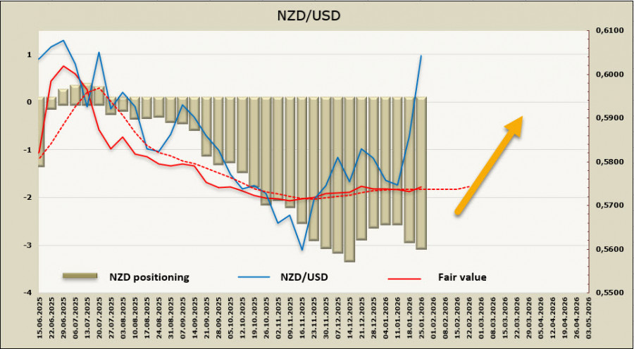 Инфляция в 4 квартале в Новой Зеландии ушла выше целевого диапазона РБНЗ 1-3%, показав 3.1% г/г, данные по базовой инфляции неоднозначны, то есть не отражают тенденцию к дезинфляции, данные по экономической активности подтверждают предварительный вывод об устойчивом росте экономики в конце 2025 г. Выход инфляции за пределы целевого диапазона означает, что рыночные ожидания относительно первого повышения ставки РБНЗ переносятся на более ранний срок, банк BNZ, к примеру, неделю назад ждал такого повышения в феврале 2027г, теперь же видит этот шаг в декабре 2026 г. Излишне говорить, что подобные переоценки всегда действуют на валюту как очевидный бычий фактор. Ну и, конечно, резкий рост экономической активности в конце года не мог не сказаться на прогнозах по ВВП. Модель Kiwi-GDP Nowcast от РБНЗ по состоянию на конец прошлой недели оценивала рост ВВП в 4 квартале на 0.9% к/к, в целом индикатор показывает рост активности, что также является бычьим фактором для киви. Добавим, что опубликованные ранее индексы деловой активности в декабре показали сильный рост, продолжается рост транзакций по банковским картам.Таким образом, уже сейчас можно с уверенностью сказать, что РБНЗ свою функцию выполнил, снизив ставку до приемлемого уровня, при которой экономика получила импульс к развитию. Если же инфляция стабилизируется на текущих уровнях или даже покажет признаки роста, то в этом случае экономика Новой Зеландии вполне выдержит 1-2 повышения ставки. В совокупности картина для киви явно бычья даже без учета фактора слабого доллара. Если же в рассмотрение включить и ситуацию вокруг доллара, то она может разве что придать киви дополнительный импульс. После того как Трамп объявил, что слабость доллара его не беспокоит, можно сложить все тенденции последних месяцев, среди которых – безудержный рост на рынке драгметаллов, чтобы прийти к очевидному выводу о том, что доллар, похоже, вступил в период сильного кризиса. Пока этот кризис сдерживается якобы уверенным ростом ВВП США, но доверять статистическим данным поводов все меньше, особенно на фоне резкого ухудшения на рынке труда, который длится уже полгода, и отсутствия каких-либо признаков оживления экономической активности в промышленном секторе. Расчетная цена делает попытку оторваться от долгосрочной средней вверх, пока это не очень выраженное движение, поскольку до пятницы все было тихо, и обрушение доллара еще не началось, соответственно, изменения в спекулятивном позиционировании еще не отражены в расчетах.
