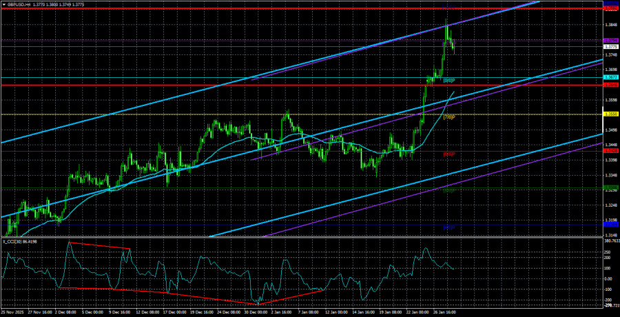 Валютная пара GBP/USD в среду торговалась идентично паре EUR/USD. По сути, рынок торгует сейчас доллар, а остальные валюты лишь «снимают сливки». На этой неделе Трамп уже успел разразиться гневными тирадами в адрес Канады, пригрозил повысить пошлины для нее до 100%, а также поднял пошлины для Южной Кореи до 25%. Во вторник вечером президент США назвал падение курса доллара «замечательным событием» и добавил, что текущая ситуация укрепит позиции американских производителей на мировых рынках. Также президент США заявил, что мог бы управлять курсом доллара, как йо-йо, но сейчас не видит в этом необходимости. Таким образом, даже событий 2026 года(а прошел всего лишь один месяц) хватает для того, чтобы американская валюта еще долго находилась в нисходящем пике. На наш взгляд, в 2026 году мы увидим ту же самую картину, что и в 2025 году. Будет сильный тренд, в рамках которого доллар потеряет еще 10-15% стоимости, затем – коррекция или флэт. Также стоит отметить, что рынок распродает доллар еще и на фоне опасений ухода Пауэлла. Глава ФРС покинет свой пост в мае текущего года, а на его место придет человек, который беспрекословно будет выполнять указы Белого дома. Но изменит ли смена власти внутри регулятора что-то для доллара и для монетарной политики? Чтобы ответить на два этих вопроса, следует разобраться более детально, что к чему. Комитет FOMC состоит из 12 голосующих членов, и в данное время лишь трое – на стороне Трампа. Если Пауэлл уйдет, а новым президентом ФРС станет не Уоллер или Боуман, то их число возрастет до четырех. Все равно мало, чтобы опустить ключевую ставку до 2%. Некоторые эксперты считают, что новый глава ФРС будет оказывать внутреннее давление на членов Монетарного комитета, однако, на наш взгляд, это вряд ли возможно. Гораздо проще поверить в то, что Трамп все-таки добьется увольнения Лизы Кук, а после этого – приступит к увольнению других чиновников, которые не хотят голосовать за смягчение политики. Теперь настало время ответить на второй вопрос. Что изменит уход Пауэлла для доллара США? Ведь трейдерам интересно именно это! Если существует риск более сильного и более быстрого снижения ключевой ставки, то доллар может рассчитывать только на падение. Но вот незадача! Он уже падает больше года, если брать вторую каденцию Трампа у руля США, и больше трех лет, если брать самое начало восходящего тренда по EUR/USD. Таким образом, смена мнения на «голубиное» внутри Монетарного комитета ФРС вряд ли возможна даже после мая 2026 года, а доллар будет падать, что с текущей монетарной политикой, что с более «мягкой». Средняя волатильность пары GBP/USD за последние 5 торговых дней составляет 128 пунктов. Для пары фунт/доллар это значение является «высоким». В четверг, 29 января, таким образом, мы ожидаем движения внутри диапазона, ограниченного уровнями 1,3646 и 1,3902. Старший канал линейной регрессии направлен вверх, что указывает на восстановление тренда. Индикатор CCI шесть раз заходил в область перепроданности за последние месяцы и сформировал огромное количество «бычьих» дивергенций, что постоянно предупреждало трейдеров о грядущем возобновлении восходящего тренда. Заход в область перекупленности указывает на коррекцию. Ближайшие уровни поддержки: S1 – 1,3672 S2 – 1,3550 S3 – 1,3428 Ближайшие уровни сопротивления: R1 – 1,3794 R2 – 1,3916