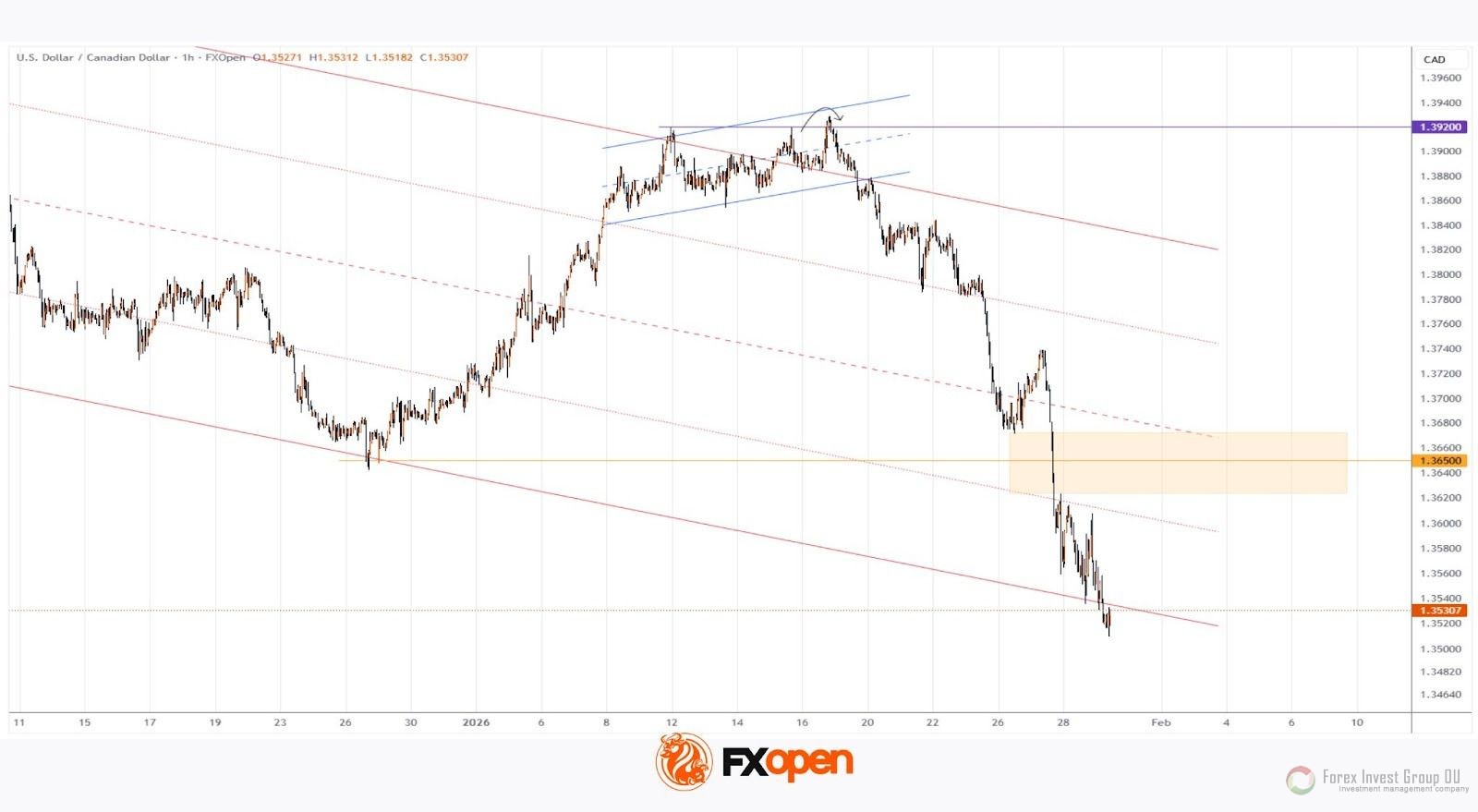 Хотя обошлось без сюрпризов, а решения центральных банков совпали с прогнозами аналитиков, реакция пары USD/CAD оказалась весьма динамичной – после всплеска волатильности курс опустился ниже минимума 2025 года. Более того, на графиках старших периодов заметен медвежий пробой поддержки, которая проходит через минимумы 2023-2025 годов.