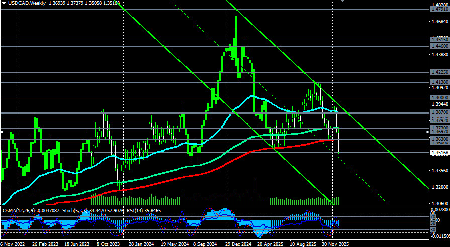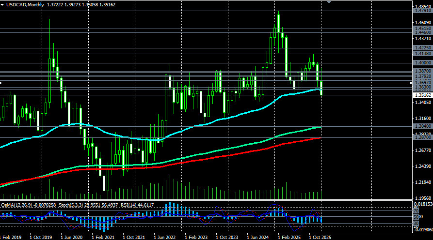 Завершив в среду 2-дневное заседание, руководители ФРС большинством голосов (десять против двух) приняли решение сохранить процентную ставку в диапазоне 3,50–3,75%, что совпало с рыночными ожиданиями. Кроме ФРС, как известно, вчера свое решение по процентной ставке принял также и Банк Канады (см. наш вчерашний «USD/CAD: решения центральных банков вряд ли кардинально изменят ситуацию» и сегодняшний обзоры «USD/CAD: итоги решений центробанков Канады и США»), сохранив ее на отметке 2,25%, что также совпало с ожиданиями рынка. Эти решения не смогли существенно повлиять на динамику пары USD/CAD, продолжившую снижение. Сегодня она достигла нового локального минимума вблизи 1.3508, соответствующего минимумам октября 2024 года. На момент же публикации данной статьи, USD/CAD торговалась вблизи отметки 1.3515. Несмотря на некоторую коррекцию от достигнутых сегодня минимумов, нисходящая тенденция цены сохраняется, поддерживаемая, в первую очередь, слабостью американского доллара. После пробоя в минувший вторник ключевых уровней поддержки 1.3630 (ЕМА200 на недельном графике), 1.3600 (ЕМА50 на месячном графике) USD/CAD перешла в зону долгосрочного медвежьего рынка. В случае дальнейшего снижения целями станут ключевые уровни поддержки 1.3040 (ЕМА144 на месячном графике), 1.3000. Пробой стратегического уровня поддержки 1.2870 (ЕМА200 на месячном графике) выведет цену в зону глобального медвежьего рынка. Самым ранним же сигналом для начала реализации данного сценария может стать пробой «круглой» отметки 1.3500.В альтернативном сценарии цена может возобновить рост, а USD/CAD укрепится в диапазон 1.3630 (ЕМА200 на недельном графике) – 1.3730 (ЕМА144 на недельном графике). В случае его пробоя и дальнейшего роста цена может направиться к верхней границе нисходящего канала на дневном графике и к отметкам 1.3860 (ЕМА144 на дневном графике), 1.3870 (ЕМА200 на дневном графике). Пробой «круглой» отметки 1.3900 и дальнейший рост будет означить выход цены в зону среднесрочного бычьего рынка и полное восстановление глобального бычьего тренда пары. Самым ранним сигналом для реализации данного сценария может стать пробой сегодняшнего максимума 1.3568. Пока же в преимуществе – короткие позиции. Ждем дальнейшего снижения цены. Уровни поддержки: 1.3500, 1.3400, 1.3300, 1.3200, 1.3100, 1.3040, 1.3000, 1.2900, 1.2870 Уровни сопротивления: 1.3570, 1.3600, 1.3630, 1.3700, 1.3730, 1.3790, 1.3800, 1.3810, 1.3860, 1.3870, 1.3900, 1.4000 Торговые сценарии
