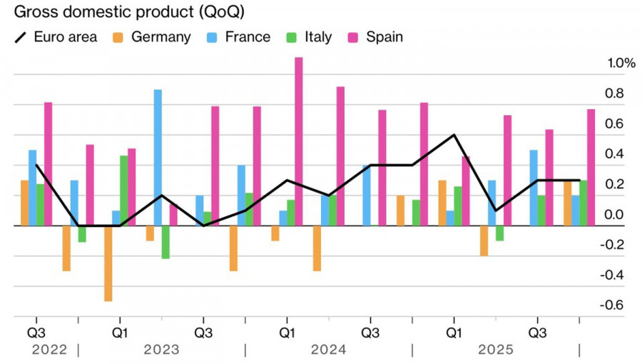 Экономика еврозоны проявляет удивительную устойчивость, но это не помогает EUR/USD. В центре внимания инвесторов находятся вопросы выбора Дональдом Трампом нового главы ФРС и реакции ЕЦБ на недавнее укрепление евро. В его основе лежит слабость доллара США, обусловленная желаниями Белого дома, а не макроэкономической статистикой. В четвертом квартале ВВП валютного блока расширился на 0,3%, превысив прогнозы экспертов Bloomberg. Лучше оценок выглядели три из четырех крупнейших экономик еврозоны – Германия, Италия и Испания. Причем последняя подтвердила статус локомотива роста, расширившись на 0,8%. Динамика европейской экономики