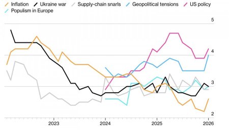 Позитивные цифры по ВВП усиливают аргументы в пользу удержания ставки по депозитам на уровне 2% на февральском заседании Управляющего совета. Рынки больше интересует, станет ли ЕЦБ проявлять недовольство недавним взлетом EURUSD. В теории укрепление евро может сдерживать инфляцию. Это создаст основания для смягчения денежно-кредитной политики, которого никто не ждет. Напротив, доля ожидающих повышения ставок в 2026-2027 экспертов Bloomberg выросла с 25% до 33%. Респонденты считают политику Белого дома и геополитику главными рисками для экономики валютного блока. Их тревожность вокруг последней возросла на фоне намерений Дональда Трампа купить Гренландию, связанных с этим тарифных угроз и отступления президента США. Динамика основных рисков для экономики еврозоны