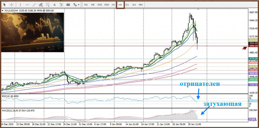 Сегодня золото ускоряет снижение, опускаясь ниже круглого уровня $5000, поддерживая медвежий уклон.