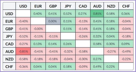 А с технической точки зрения пара приблизилась к круглому уровню 154,00, где проходит 100-дневная SMA, преодолев её, цены устремятся к круглому уровню 155,00. Если цены не удержат уровни 152,70 и круглый 152,00, то ускорят падение к очень значимой 200-дневной SMA.В таблице ниже отражены процентные изменения японской иены против ключевых валют на сегодня. Японская йена отметила самый заметный подъем против австралийского доллара.Материал предоставлен компанией InstaForex - www.instaforex.com