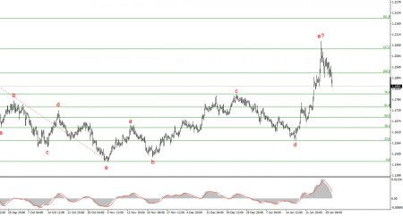 Волновая разметка 4-часового графика для инструмента EUR/USD понесла небольшие изменения, но кардинально ничего не поменялось. Об отмене повышательного участка тренда, который берет свое начало в январе прошлого года, речи по-прежнему не идет, лишь внутренняя волновая структура время от времени корректируется. На мой взгляд, инструмент завершил построение глобальной волны 4(нижняя картинка). Если это предположение верно, то в данное время началось и продолжается построение волны 5, которая может принять весьма протяженный вид, и цели которой разбросаны вплоть до 25-й фигуры. Внутренняя волновая структура предполагаемой волны 5 не совсем однозначная(верхняя картинка). Повышательный набор волн не может считаться импульсным из-за довольно сильных коррекционных волн. Поэтому на текущий момент он трактуется, как a-b-c-d-e. Однако, если волна 5 примет протяженный вид, то ее внутренняя структуры тоже получится достаточно сложной. Как следствие, мы можем наблюдать сейчас построение волны 3 в 3 в 5. Так или иначе, я жду дальнейшего повышения инструмента EUR/USD, но в ближайшие дни рынок может заниматься построение одной или нескольких коррекционных волн.