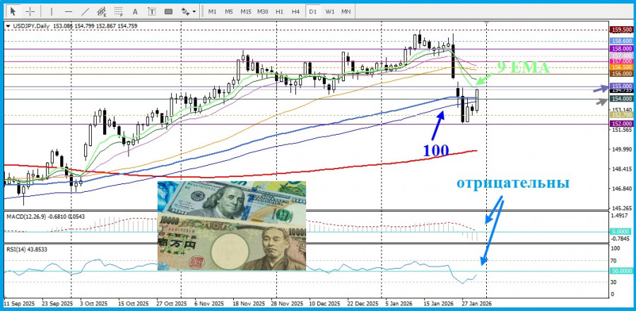 В пятницу перед выходными курс USD/JPY отскочил в район 155,00, благодаря восстановлению доллара США. Рост пары отражает переоценку рынками траекторий денежно-кредитной политики ФРС и Банка Японии, а также смену ожиданий относительно их политики.