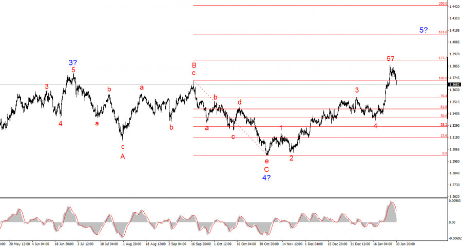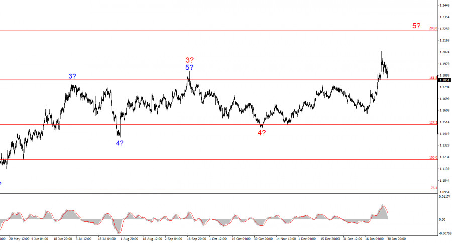 Британский фунт полностью повторяет путь европейской валюты. Последняя волновая структура – повышательная, пятиволновая, следовательно, по канонам волнового анализа, сейчас должно начаться построение одно, а лучше трех коррекционных волн. Напомню, что глобальная волна 5, с моей точки зрения, не завершена. Я жду большего повышения и евро, и фунта. В этом случае волновая разметка может трансформироваться в более сложную, но одну коррекционную волну мы все равно должны увидеть. Следовательно, на следующей неделе будет превалировать коррекционный сценарий. Что может его поддержать? В первую очередь, следует отметить заседание Банка Англии. BoE, как и ECB, не собирается в начале февраля проводить раунд смягчения денежно-кредитной политики, но это не означает, что рынок пропустит это событие мимо. В сопроводительном заявлении Банка Англии будут содержаться прогнозы по ключевым экономическим показателям, а итоги голосования MPC по процентной ставке могут удивить, как приятно, так и неприятно. В данное время консенсус-прогноз подразумевает два голоса в пользу снижения ставки и семь против. Если голосующих «за» будет больше, рынок может усилить давление на британца. Однако я думаю, что сильного давления на фунт мы не увидим. Коррекция – есть коррекция, а инфляция в Великобритании по итогам декабря ускорилась до 3,4%. Если сравнить это значение с последним локальным пиком, то индекс потребительских цен в Британии замедлился не так уж сильно в последние 6 месяцев. На мой взгляд, для следующего снижения процентной ставки требуется падение инфляции ниже 3%. Больше важных событий в Великобритании не запланировано на следующую неделю, но следует помнить о том, что Дональд Трамп в новом году практически каждые пару дней ошарашивает рынки. Я не исключаю, что так будет и на этот раз. Следовательно, новости от Трампа могут даже перекрыть собой заседание Банка Англии.