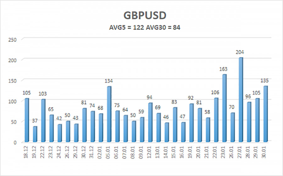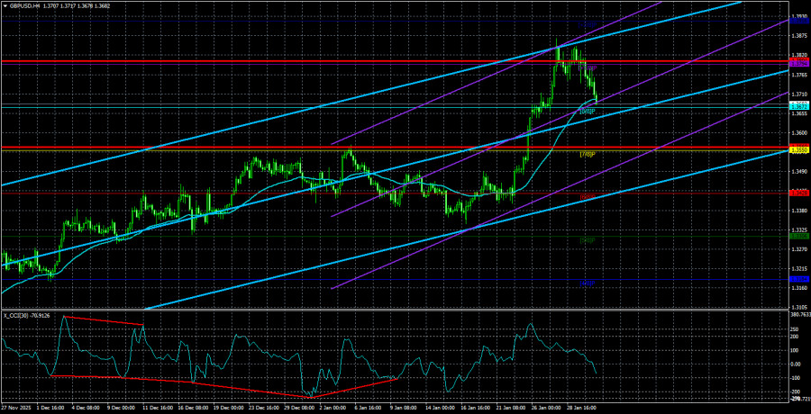 Валютная пара GBP/USD в конце прошлой недели также показала достаточно сильное падение, которое было основано на технических факторах. Никаких важных событий в пятницу не было запланировано ни в Штатах, ни в Великобритании, и даже от Трампа не поступало никаких важных сообщений. У доллара нет причин для резкого и сильного роста. Таким образом, как и раньше, мы считаем, что любое укрепление американской валюты – это априори коррекция. Хоть сейчас на первом месте для рынка стоят глобальные фундаментальные темы, макроэкономический фон на этой неделе тоже может оказать влияние на настроение рынка. Как мы уже говорили, первая неделя каждого месяца – это время публикации отчетов по деловой активности ISM, рынку труда и безработице в США. Уже в понедельник станет известен индекс ISM в секторе производства за январь, но сильного улучшения от него ждать не приходится. Скорее всего, показатель останется ниже «ватерлинии» 50,0. В среду будет опубликован индекс ISM для сектора услуг, который явно себя чувствует лучше, чем сектор производства. В пятницу – уровень безработицы и NonFarm Payrolls. Эксперты вновь ожидают слабых значений от двух ключевых показателей. К примеру, уровень безработицы прогнозируется на 4,4-4,5%, но показатель растет в США уже три года. Растет он не быстро, за это время он увеличился всего на 1%. Тем не менее, он растет, а значит тенденция негативная. Что касается NonFarm Payrolls, то по итогам января может быть создано от 40 до 70 тысяч новых рабочих мест. Здесь следует напомнить, что нормальным значением показателя является 150-200 тысяч новых рабочих мест каждый месяц. Таким образом, даже если фактическое значение за январь будет выше, его вряд ли можно будет считать позитивным для доллара. Также отметим заседание Банка Англии, где в очередной раз значение будут иметь результаты голосования Монетарного комитета по ставке. Рынок уверен, что будет принято решение сохранить ставку на прежнем уровне. Мы считаем также, так как последний отчет по инфляции показал ускорение. Однако рынок может отреагировать на более «голубиные» или менее «голубиные» результаты голосования. Ожидается, что в пользу нового смягчения монетарной политики проголосуют всего двое. Не стоит забывать и о «факторе Трампа». Дональд Трамп легко и свободно может ввести новые тарифы, атаковать Иран, захотеть завладеть еще какой-нибудь «никому не нужной» территорией и так далее. Любая подобная новость ввергнет рынки в новый шок. Истории с Джеромом Пауэллом, ФРС, Канадой и Южной Кореей тоже не завершены. В краткосрочной перспективе доллар может показать рост, может отреагировать на положительные новости. В долгосрочной мы продолжаем ожидать от него только падения. Средняя волатильность пары GBP/USD за последние 5 торговых дней составляет 122 пункта. Для пары фунт/доллар это значение является «высоким». В понедельник, 2 февраля, таким образом, мы ожидаем движения внутри диапазона, ограниченного уровнями 1,3560 и 1,3804. Старший канал линейной регрессии направлен вверх, что указывает на восстановление тренда. Индикатор CCI шесть раз заходил в область перепроданности за последние месяцы и сформировал огромное количество «бычьих» дивергенций, что постоянно предупреждало трейдеров о грядущем возобновлении восходящего тренда. Заход в область перекупленности предупредил о коррекции. Ближайшие у