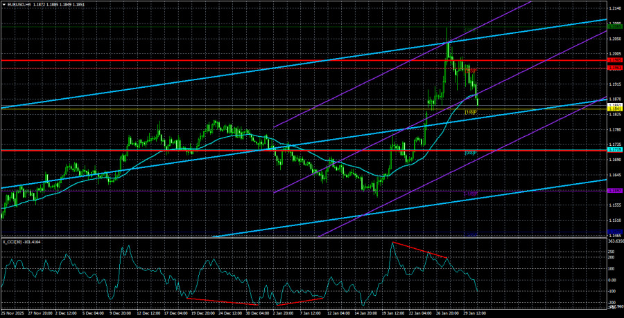 Валютная пара EUR/USD в течение пятницы довольно неожиданно для многих показала сильное падение. Почему это падение выглядит странным и удивительным? Потому что никаких оснований для резкого укрепления доллара не было. Тем не менее, доллар рос не только в пятницу, но и в среду, и в четверг. С чем это может быть связано? На наш взгляд, если фундаментальный фон абсолютно не изменился, то причина кроется только в технических факторах. В период с 19 января по 27 января пара буквально взлетела на 500 пунктов, после чего часть трейдеров решила зафиксировать прибыль по длинным позициям. Проще говоря, началась обычная техническая коррекция, которая пока никак не влияет на общую техническую картину. Конечно, возможны различные варианты развития событий. Напомним, что Дональд Трамп откровенно порадовался обесцениванию доллара в последний год, но в то же время в Евросоюзе тоже не хотят видеть евровалюту «дорогой». Следует помнить, что дорогая национальная валюта для экспортно-ориентированных стран – это удар по экспорту, удар по ВВП. А в Европе с экономическим ростом уже давно не все в порядке. Таким образом, мы не исключаем, что ЕЦБ начнет применять различные инструменты, чтобы остановить рост евро. Или уже начал. Также следует заметить, что о коррекции трейдеры были предупреждены заранее – индикатор CCI дважды зашел в область перекупленности и сформировал две «медвежьи» дивергенции. Как итог вышесказанного, текущее падение доллара не было спровоцировано фундаментальными причинами. А значит вряд ли будет долгим. На новой неделе макроэкономический фон вновь может игнорироваться трейдерами. Глобальных фундаментальных событий остается предостаточно, чтобы рынок полностью сосредоточился на них. Напомним, что американские авианосцы в любой момент готовы нанести удар по Ирану, а в субботу в США начался очередной «шатдаун». Таким образом, новый «шторм» на рынке может начаться в любой момент. Начался новый месяц, а это значит, что в Штатах будет опубликована статистика по деловой активности, рынку труда и безработице. Эти данные тоже могут находиться в тени более важных, глобальных событий, но все же вероятность их отработки гораздо выше, чем отчетов по ВВП или промышленному производству. В Евросоюзе из важных событий следует выделить отчет по инфляции за январь, хотя, конечно, «важным» его можно назвать весьма условно. Инфляция в Европе остается стабильно около 2%, поэтому никакого влияния на монетарную политику ЕЦБ в данное время не оказывает. Однако по итогам января индекс потребительских цен может снизиться до 1,7%(судя по прогнозам), а это уже опасное значение для ЕЦБ. Если инфляция продолжит замедляться, ЕЦБ придется возобновить смягчение монетарной политики. Также отметим заседание ЕЦБ в четверг, которое имеет сейчас тот же статус, что и отчет по инфляции. Европейский регулятор вряд ли примет важные решения, но Кристин Лагард может прокомментировать отчет по инфляции и задать вектор монетарной политики на 2026 год. Средняя волатильность валютной пары EUR/USD за последние 5 торговых дней по состоянию на 2 февраля составляет 134 пункта и характеризуется, как «высокая». Мы ожидаем движение пары между уровнями 1,1718 и 1,1985 в понедельник. Старший канал линейной регрессии направлен вверх, что указывает на дальнейший рост евровалюты. Индикатор CCI заходил 