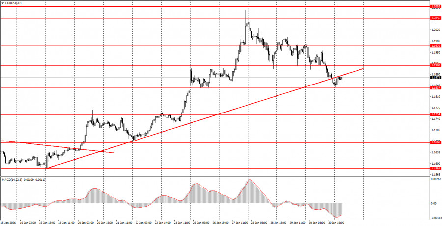 На часовом таймфрейме началась коррекция. Однако напомним, что флэт, который длился 7 месяцев, можно считать завершенным. Если так, то в данное время восстановился долгосрочный восходящий тренд, поэтому в 2026 году мы ждем нового падения доллара. Общий фундаментальный и макроэкономический фон остается для американской валюты очень слабым, поэтому мы полностью поддерживаем дальнейшее движение на Север. В понедельник начинающие трейдеры могут открывать новые длинные позиции в случае отскока от области 1,1830-1,1837 с целью 1,1908. Закрепление цены ниже области 1,1830-1,1837 позволит открывать шорты с целью 1,1745-1,1754. На 5-минутном ТФ следует рассматривать уровни 1,1354-1,1363, 1,1413, 1,1455-1,1474, 1,1527-1,1531, 1,1550, 1,1584-1,1591, 1,1655-1,1666, 1,1745-1,1754, 1,1830-1,1837, 1,1908, 1,1970-1,1988, 1,2044-1,2056, 1,2092-1,2104. Сегодня в Германии, Евросоюзе и США будут опубликованы индексы деловой активности в секторах производства за январь. Особое внимание следует уделить американскому ISM, который является наиболее значимым.Основные правила торговой системы:
