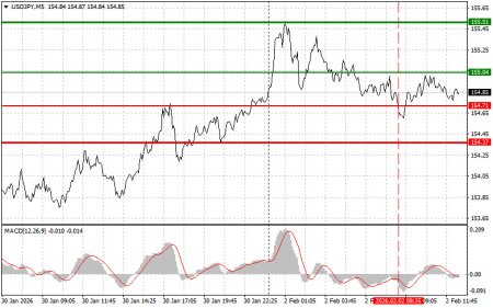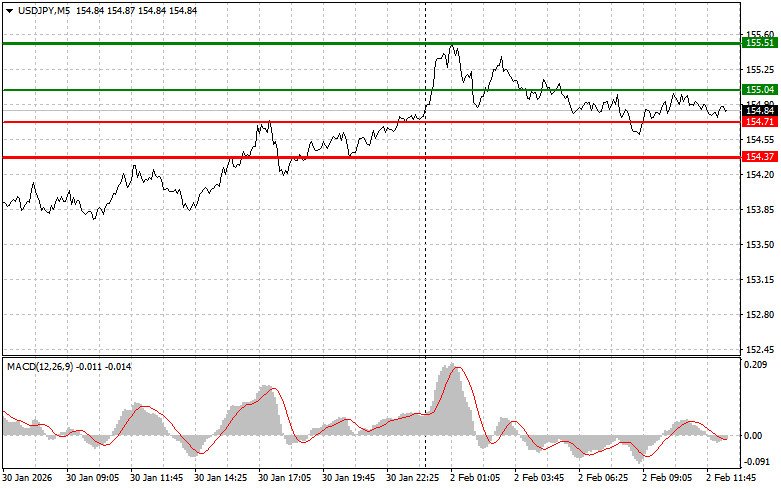 Разбор сделок и советы по торговле японской иенойТест цены 154.71 пришелся на момент, когда индикатор MACD много прошел вниз от нулевой отметки, что ограничивало нисходящий потенциал пары. По этой причине я не продавал доллар.Далее нас ждут довольно интересные новости, связанные с американской экономикой. Ожидаются цифры по индикатору ISM для производственной сферы, который служит важным барометром здоровья экономики. Превышение отметки в 50 пунктов говорит об увеличении деловой активности, а снижение ниже этого уровня указывает на её замедление. Что касается выступления Рафаэля Бостика, главы Федерального резервного банка Атланты, основное внимание будет уделено его высказываниям о текущей денежно-кредитной политике ФРС и перспективах процентных ставок. Учитывая, что до лета в ФРС ничего менять не собираются, инвесторы будут искать признаки того, как Федеральный резерв оценивает опасности инфляции из-за резкого обвала американского доллара в этом году. Мнение Бостика, как члена Комитета по операциям на открытом рынке с правом голоса при принятии решений по монетарной политике, имеет большое значение.Что касается внутридневной стратегии, то больше буду опираться на реализацию сценариев №1 и №2.Сигнал на покупкуСценарий №1: покупать USD/JPY сегодня планирую при достижении точки входа в районе 155.04 (зеленая линия на графике) с целью роста к уровню 155.51 (более толстая зеленая линия на графике). В районе 155.51 буду выходить из покупок и открывать продажи в обратную сторону (расчет на движение в 30-35 пунктов в обратную сторону от уровня). Рассчитывать на рост пары сегодня можно после сильных данных по США. Важно! Перед покупкой, убедитесь в том, что индикатор MACD находится выше нулевой отметки и только начинает свой рост от нее.Сценарий №2: покупать USD/JPY сегодня также планирую в случае двух подряд тестов цены 154.71 в момент, когда индикатор MACD будет находиться в области перепроданности. Это ограничит нисходящий потенциал пары и приведет к обратному развороту рынка вверх. Можно ожидать рост к противоположным уровням 155.04 и 155.51.Сигнал на продажу Сценарий №1: продавать USD/JPY сегодня планирую после обновления уровня 154.71 (красная линия на графике), что приведет к быстрому снижению пары. Ключевой целью продавцов будет уровень 154.37, где буду выходить из продаж, а также открывать сразу покупки в обратную сторону (расчет на движение в 20-25 пунктов в обратную сторону от уровня). Давление на пару вернется в случае слабой статистики. Важно! Перед продажей, убедитесь в том, что индикатор MACD находится ниже нулевой отметки и только начинает свое снижение от нее. Сценарий №2: продавать USD/JPY сегодня также планирую в случае двух подряд тестов цены 155.04 в момент, когда индикатор MACD будет находиться в области перекупленности. Это ограничит восходящий потенциал пары и приведет к обратному развороту рынка вниз. Можно ожидать снижения к противоположному уровню 154.71 и 154.37.Что на графике:Тонкая зеленая линия – цена входа, по которой можно покупать торговый инструмент;Толстая зеленая линия – предположительная цена, где можно расставлять Take Profit или самостоятельно фиксировать прибыль, так как выше этого уровня дальнейший рост маловероятен;Тонкая красная линия – цена входа, по которой можно продавать торговый инструмент;Толстая красная линия – предположительная цена, гд