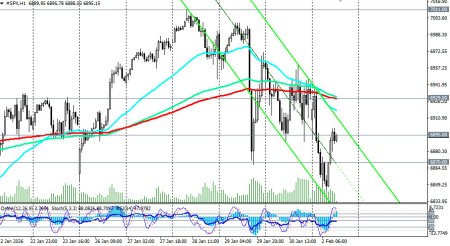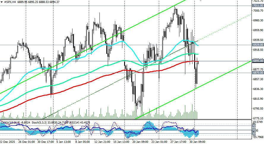 Снижение доходностей сопровождается ожиданиями сохранения процентных ставок ФРС на текущем уровне как минимум до ближайших заседаний. Инструмент CME FedWatch показывает, что рынок в основном закладывает паузу в изменении ставок, пока инфляция и рынок труда не дадут более чётких сигналов. Техническая картина Фьючерсы на индекс S&P 500 (SPX в торговом терминале) после открытия с гэпом вниз закрепились в «красной» зоне. Важным уровнем поддержки остается зона вокруг 6870.00 - вблизи 50-дневной скользящей средней. Её удержание критически важно для предотвращения более глубокой коррекции. Ближайшее сопротивление находится в районе 6930.00 (200-периодная скользящая средняя на 1-часовом графике). Сценарий углубления коррекции реализуется при пробое зоны поддержки 6870.00 – 6800.00 с целью движения к 6700.00 – 6650.00 (144-периодная скользящая средняя на дневном графике). *) подробнее см. в S&P 500 (SPX): сценарии динамики на 02.02.2026