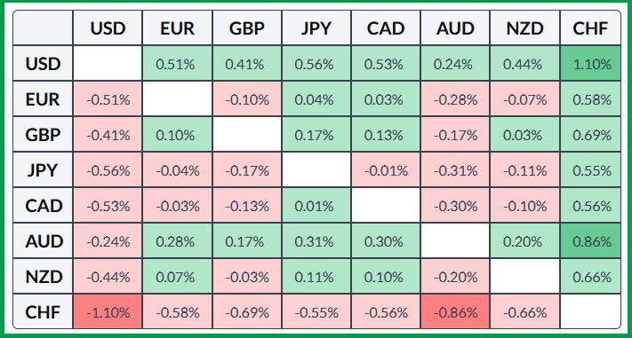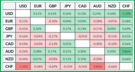 Основная поддержка у 100-дневной ЕМА вблизи круглого уровня 154,00. И пока осцилляторы на дневном графике находятся в отрицательной зоне, у быков не хватает сил на победу. Тем не менее гистограмма МАCD выравнивается, указывая на ослабление медвежьих настроений.В таблице ниже показано процентное изменение доллара США по отношению к основным валютам сегодня. Доллар США был сильнее по отношению к швейцарскому франку.Материал предоставлен компанией InstaForex - www.instaforex.com