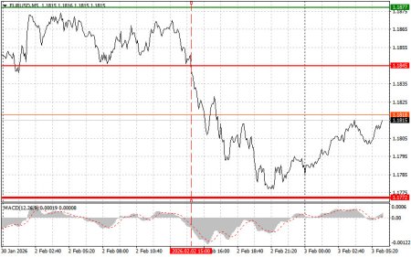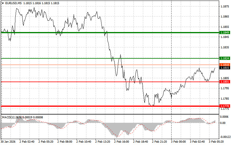 Разбор сделок и советы по торговле европейской валютойТест цены 1.1845 пришелся на момент, когда индикатор MACD много прошел вниз от нулевой отметки, что ограничило нисходящий потенциал пары. По этой причине я не продавал евро.Всплеск покупательской активности доллара был вызван вчерашней позитивной статистикой индекса ISM в производственном секторе, который превысил пороговое значение в 50. Это было интерпретировано участниками рынка как предвестие потенциального оздоровления экономики. Однако дальнейшая динамика пары будет определяться поступающими данными по еврозоне и заявлениями представителей ФРС, что делает ситуацию крайне изменчивой и требующей внимательного мониторинга со стороны трейдеров.Пристальное внимание будет обращено на данные по индексу потребительских цен во Франции. Если фактические значения сильно превысят прогнозы, это может усилить ожидания более ограничительной денежно-кредитной политики со стороны Европейского центробанка, что теоретически поддержит курс евро. Публикация сведений о числе безработных в Испании не самый важный показатель, однако значительное уменьшение числа безработных может говорить о восстановлении испанской экономики, что поддержит евро. В противном случае рост безработицы может вызвать беспокойство по поводу устойчивости экономического роста страны. Помимо этих двух основных показателей, участники рынка также будут внимательно отслеживать заявления представителей ЕЦБ.Что касается внутридневной стратегии, то больше буду опираться на реализацию сценариев №1 и №2.Сценарии на покупкуСценарий №1: сегодня покупать евро можно при достижении цены в районе 1.1824 (зеленая линия на графике) с целью роста к уровню 1.1849. В точке 1.1849 планирую выходить из рынка, а также продавать евро в обратную сторону в расчете на движение в 30-35 пунктов от точки входа. Рассчитывать на рост евро сегодня можно только после хороших данных. Важно! Перед покупкой, убедитесь в том, что индикатор MACD находится выше нулевой отметки и только начинает свой рост от нее.Сценарий №2: покупать евро сегодня также собираюсь в случае двух подряд тестов цены 1.1801 в момент, когда индикатор MACD будет находиться в области перепроданности. Это ограничит нисходящий потенциал пары и приведет к обратному развороту рынка вверх. Можно ожидать рост к противоположным уровням 1.1824 и 1.1849.Сценарии на продажуСценарий №1: продавать евро планирую после достижения уровня 1.1801 (красная линия на графике). Целью будет уровень 1.1778, где собираюсь выходить из рынка и покупать сразу в обратную сторону (расчет на движение в 20-25 пунктов в обратную сторону от уровня). Давление на пару сегодня вернется при слабой статистике. Важно! Перед продажей, убедитесь в том, что индикатор MACD находится ниже нулевой отметки и только начинает свое снижение от нее.Сценарий №2: продавать евро сегодня также собираюсь в случае двух подряд тестов цены 1.1824 в момент, когда индикатор MACD будет находиться в области перекупленности. Это ограничит восходящий потенциал пары и приведет к обратному развороту рынка вниз. Можно ожидать снижения к противоположному уровню 1.1801 и 1.1778.Что на графике:Тонкая зеленая линия – цена входа, по которой можно покупать торговый инструмент;Толстая зеленая линия – предположительная цена, где можно расставлять Take Profit или самостоятельно фик