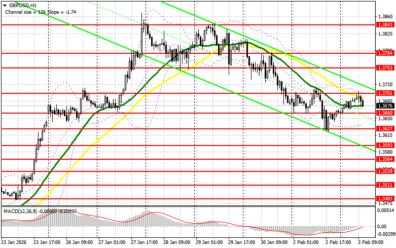 В своем утреннем прогнозе я обращал внимание на уровень 1.3692 и планировал от него принимать решения по входу в рынок. Давайте посмотрим на 5-минутный график и разберемся с тем, что там произошло. Рост и формирование ложного пробоя в районе 1.3692 привели к точке входа на продажу фунта, что вылилось в небольшое снижение пары на 17 пунктов. На вторую половину дня техническая картина была полностью пересмотрена.Для открытия длинных позиций по GBP/USD требуется: Отсутствие статистики по Великобритании позволило фунту немного восстановиться, однако продавцы воспользовались моментом и тут же проявили себя, опираясь на более привлекательные цены. Далее нас ждут важные цифры по уровню вакансий и текучести рабочей силы от бюро статистики труда США. Кроме этого, выйдет индекс экономического оптимизма от RCM/TIPP, а также выступят член FOMC Томас Баркин и член FOMC Мишель Боуман. Жесткая повестка политиков и хорошие данные станут новым поводом для продажи британского фунта. При снижении пары, только формирование ложного пробоя в районе поддержки 1.3660 даст точку входа в длинные позиции в расчете на восстановление к уровню 1.3701, выступающему определенной верхней границей бокового канала. Прорыв с обратным тестом сверху вниз этого диапазона приведут уже к новой точке входа в длинные позиции с перспективой выхода на 1.3753, что вернет развитие бычьего рынка. Самой дальней целью окажется область 1.3784, где собираюсь фиксировать прибыль. При сценарии снижения GBP/USD и отсутствия активности со стороны быков на 1.3660, давление на пару вернется. В таком случае лишь формирование ложного пробоя в районе 1.3627 будет подходящим условием на открытие длинных позиций. Покупать GBP/USD сразу на отскок собираюсь от поддержки 1.3593 с целью коррекции в 30-35 пунктов внутри дня.Для открытия коротких позиций по GBP/USD требуется:Продавцы проявили себя, и вполне возможно сегодня мы увидим очередную волну снижения фунта во второй половине дня. В случае бычьей реакции на данные по США первого проявления медведей ожидаю увидеть лишь в районе сопротивления 1.3701, где проходят средние скользяще, играющие на их стороне. Формирование там ложного пробоя станет подтверждением правильной точки входа на продажу с целью снижения в район поддержки 1.3660, выступающей серединой бокового канала. Прорыв и обратный тест снизу вверх этого диапазона приведут к сносу стоп-приказов, открыв путь к 1.3627. Там ожидаю более активного проявления крупных покупателей. Самой дальней целью выступит область 1.3593, где собираюсь фиксировать прибыль. Если спрос на фунт вернется во второй половине дня, а медведи не проявят себя в районе 1.3701 по аналогии с тем, что я разбирал выше, быки получат шанс на новый крупный рывок вверх. В таком случае продажи лучше всего отложить до теста сопротивления 1.3753. Открывать там короткие позиции буду только на ложном пробое. При отсутствии движения вниз и там, короткие позиции на отскок поищу в районе 1.3784, но лишь в расчете на коррекцию пары вниз на 30-35 пунктов внутри дня.Рекомендую ознакомиться:В COT-отчете (Commitment of Traders) за 27 января наблюдался рост длинных и коротких позиций. В ближайшее время пройдет заседание Банка Англии по денежно-кредитной политике. Наверняка управляющие оставят процентные ставки без изменений для дальнейшей борьбы с инфляцией, что должно оказать поддержку британскому фунту и