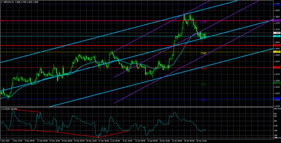 Валютная пара GBP/USD во вторник большую часть дня простояла на одном месте. В этом нет ничего удивительного. Европейская торговая сессия уже в который раз вызывала только желание закрыть графики и пойти гулять. Американская сессия традиционно была более активной, но! Макроэкономический фон отсутствовал, фундаментальных событий не было никаких. Таким образом, пара GBP/USD остается в рамках нисходящей коррекции, которая может завершиться в любой момент. Если европейская валюта скорректировалась почти на 61,8%, то фунт – на 38,2%. На этой неделе состоится заседание Банка Англии, которое многими трейдерам все еще рассматривается, как важное событие. Мы бы хотели напомнить, что в 2025 году динамика доллара зависела на 100% даже не от монетарной политики ФРС – крупнейшего центрального банка в мире. Доллар падает уже второй год подряд на основании политики Дональда Трампа. А если считать тренд с самого начала, то доллар обесценивается уже четвертый год подряд. Однако в 2022-2024 годы причины заключались как раз в монетарной политике ФРС, а сейчас – в политике Дональда Трампа. Напомним, что осенью 2022 года инфляция в США начала замедляться с рекордных значений. В это время на рынке начали зреть ожидания смягчения монетарной политики ФРС. С тех пор ФедРезерв снизил ставку семь раз. Это не много, это не мало, но рынок явно ждал большего и закладывал большее снижение ключевой ставки в цены. Если помните, то только на прошлый год ожидания рынка составляли 4 смягчения, а на 2023 год – 7. Однако менее «голубиный» подход ФРС не помешал рынку отрабатывать наиболее «голубиные» ожидания. Еще один серьезный фактор падения доллара – технический. Откройте месячный ТФ, и вы увидите, что нисходящий тренд сохранялся в период с ноября 2007 года по сентябрь 2022 года. То есть полные 15 лет. Ни один тренд не вечен, а британский фунт(или евро) – это не иранский риал, чтобы только обесцениваться. Глобальные тренды меняются, экономика циклична. Таким образом, в ближайшие годы британская валюта вполне может рассчитывать на восстановление в область 1,60$. Еще один очень важный фактор – фактор Трампа. Но не его политики, а страстного желания обесценить доллар как можно сильнее. Президент США понимает, что увеличить объемы экспорта будет крайне сложно, поэтому делает сразу два хода конем. Первый – понизить импорт, чтобы нивелировать дефицит торгового баланса. Второй – обесценить доллар, чтобы увеличить экспорт. Вот он рецепт экономического счастья от американского президента. Поэтому, с нашей точки зрения, судьба американской валюты предрешена. Что в разрезе 2026 года, что в разрезе ближайшей пятилетки. Дорогой доллар не нужен никому в Белом Доме, а политика Трампа заставляет иностранных инвесторов бежать подальше. Таким образом, мы считаем, что заседание Банка Англии не повлияет радикальным образом ни на что. Локально его результаты могут спровоцировать, как рост, так и падение. Глобально – ничего не изменится. Средняя волатильность пары GBP/USD за последние 5 торговых дней составляет 97 пунктов. Для пары фунт/доллар это значение является «высоким». В среду, 4 февраля, таким образом, мы ожидаем движения внутри диапазона, ограниченного уровнями 1,3600 и 1,3794. Старший канал линейной регрессии направлен вверх, что указывает на восстановление тренда. Индикатор CCI шесть раз заходил в область перепрод