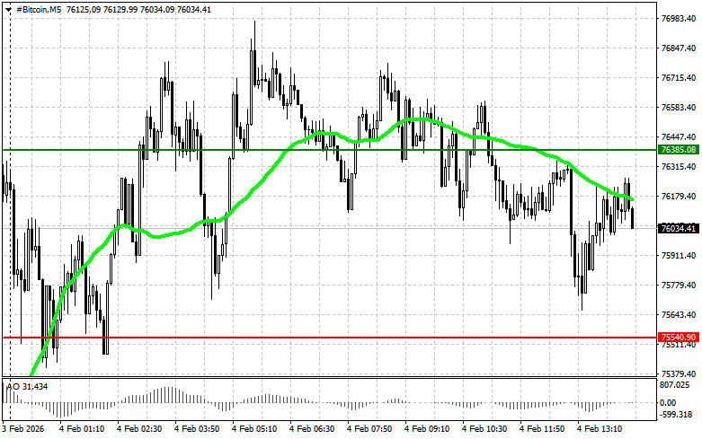 Биткоин остается в районе $76 000, но самое интересное нас ждет во второй половине дня, когда и происходят все движения. Эфир также слегка откатил от дневного максимума, после чего стабилизировался в районе $2236.Тем временем компания Galaxy Digital Майка Новограца, ярого сторонника биткоина и криптовалют, понесла убытки в размере почти полумиллиарда долларов в четвертом квартале 2025 года. Произошло это, очевидно, на фоне обвала криптовалютного рынка.В четвертом квартале прошлого года компания Galaxy зафиксировала чистый убыток в размере 482 миллионов долларов. Таким образом, общий годовой чистый убыток компании составил 241 миллион долларов. Из-за снижения цен на цифровые активы и примерно 160 миллионов долларов единовременных затрат в течение года компания закрыла год с убытком», — сказано в отчете.Акции компании Galaxy упали вчера на 13%, а рыночная капитализация компании составила около $13,5 миллиардов.Неутешительные результаты Galaxy в четвертом квартале, на фоне резкого падения цен на ключевые цифровые активы, такие как биткоин и эфир, резко контрастируют с предыдущим финансовым периодом. В третьем квартале 2025 года Galaxy сообщила о своем лучшем квартале за всю историю, при этом прибыль взлетела более чем на 1500% до 505 миллионов долларов.Стоит понимать, что Galaxy Digital Новограца ни одна компания, которая сейчас справляется с подобного рода убытками. Очень много игроков активно инвестировали в рынок криптовалют с момента победы Трампа на президентских выборах в США и продолжают это делать, так что подобного рода отчеты вряд ли пока будут вызывать турбулентность на рынке криптовалют. Что касается внутридневной стратегии на криптовалютном рынке, то действовать дальше буду, также опираясь на любые крупные просадки биткоина и эфира в расчете на продолжение развития бычьего рынка в долгосрочной перспективе, который никуда не делся. Что касается краткосрочной торговли, то стратегия и условия описаны ниже. BitcoinСценарий на покупку Сценарий №1: покупать биткоин сегодня буду при достижении точки входа в районе $76 400 с целью роста к уровню $77 500. В районе $77 500 буду выходить из покупок и продавать сразу на отскок. Перед покупкой на пробой нужно убедиться в том, что 50-дневная средняя скользящая находится ниже текущей цены, а индикатор Awesome находится в зоне выше нуля. Сценарий №2: покупать биткоин можно от нижней границы $75 500 при отсутствии рыночной реакции на ее пробой в обратную сторону к уровням $76 400 и $77 500.Сценарий на продажу Сценарий №1: продавать биткоин сегодня буду при достижении точки входа в районе $75 500 с целью падения к уровню $74 300. В районе $74 300 буду выходить из продаж и покупать сразу на отскок. Перед продажей на пробой нужно убедиться в том, что 50-дневная средняя скользящая находится выше текущей цены, а индикатор Awesome находится в зоне ниже нуля. Сценарий №2: продавать биткоин можно от верхней границы $76 300 при отсутствии рыночной реакции на ее пробой в обратную сторону к уровням $75 500 и $74 300.EthereumСценарий на покупкуСценарий №1: покупать эфир сегодня буду при достижении точки входа в районе $2263 с целью роста к уровню $2319. В районе $2319 буду выходить из покупок и продавать сразу на отскок. Перед покупкой на пробой нужно убедиться в том, что 50-дневная средняя скользящая находится ниже текущей цены, а индикатор Awesome находится в зоне выше нуля. Сценарий №2: покупать эфи