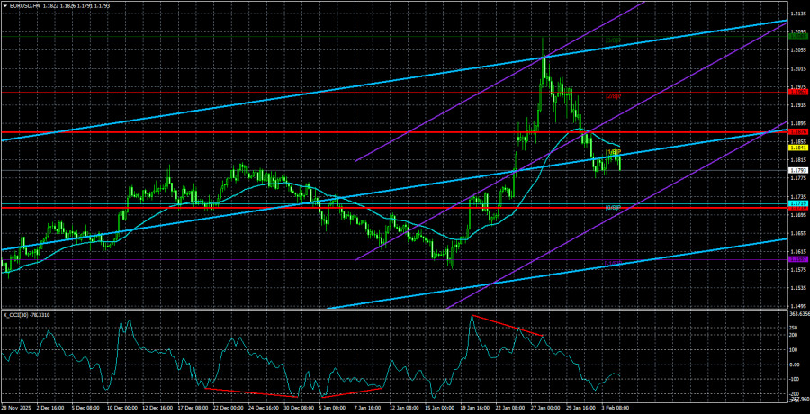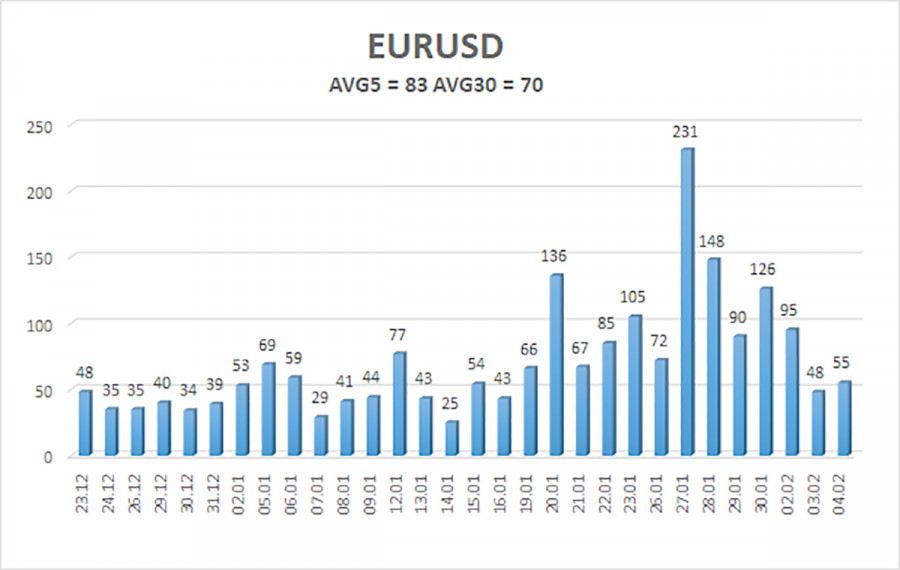 Валютная пара EUR/USD в течение среды продолжала торговаться очень вяло, словно нехотя. Как обычно, на американской торговой сессии мы увидели более интересные движения, которые были обусловлены макроэкономическим фоном в США. О чем в первую очередь следует сказать? Конечно же, об отчете по европейской инфляции. По итогам января-месяца индекс потребительских цен замедлился до 1,7%, как и прогнозировалось. Вероятно, это еще не критически низкие цифры, но они близки к ним. Напомним, что ЕЦБ в 2026 году рискует столкнуться со сразу двумя серьезными проблемами: дорогой евро и низкая инфляция. При чем, дорогой евро может быть как раз причиной низкой инфляции. Если европейская валюта растет против своих конкурентов(в частности, доллара США), это снижает европейский экспорт. Европейские компании и заводы получают меньше доходов, вынуждены сокращать производство и штат. Как следствие – еще большее замедление экономики. Замедляется экономика – снижается инфляция. А низкая инфляция – это само по себе проблема для ЕЦБ, который в последний год стремится достичь стабильного уровня на 2%. Какой из этой ситуации выход? Выход наиболее прозаичный из всех возможных – снижать ставки. Снижение ставок ускорит инфляцию и понизит курс европейской валюты. На самом деле, со вторым выводом можно легко поспорить в текущих обстоятельствах. Напомним, что в 2025 году ЕЦБ активно снижал ставки в первом полугодии, что абсолютно не мешало европейской валюте расти, как на дрожжах. Поэтому, если Дональд Трамп и дальше будет придерживаться своей абсолютно непрогнозируемой политики, то далеко не факт, что снижение ключевой ставки ЕЦБ поможет опустить курс евро. В общем, Евросоюз сталкивается с новыми для себя проблемами. Даже с одной проблемой – Дональд Трамп. Сегодня состоится выступление Кристин Лагард после заседания ЕЦБ. Поэтому можно рассчитывать на комментарии, касающиеся монетарной политики и инфляции. Возможно, именно глава ЕЦБ разложит все по полочкам и даст рынку необходимые ориентиры. Однако еще раз повторимся: даже новое смягчение монетарной политики ЕЦБ не гарантирует падение европейской валюты. Ведь дело заключается не только в ЕЦБ. ФРС, к примеру, тоже минимум дважды понизит ключевую ставку в текущем году. А если Дональд Трамп посредством Кевина Уорша и увольнения всех неугодных ему чиновников установит власть над ФРС, то снижение ключевой ставки может быть гораздо сильнее. Если ФРС снизит ставку даже только 2 раза и ЕЦБ снизит ставку 2 раза, то какие будут причины у рынка избавляться от европейской валюты в пользу нестабильного доллара? Таким образом, похоже, что Европе придется смириться с падением экспорта, снижением инфляции ниже цели, замедлением экономики и ростом курса европейской валюты. Карты на руках Трампа, благодаря которым он обеспечивает падение американской валюты, гораздо сильнее. Средняя волатильность валютной пары EUR/USD за последние 5 торговых дней по состоянию на 5 февраля составляет 83 пункта и характеризуется, как «средняя». Мы ожидаем движение пары между уровнями 1,1710 и 1,1876 в четверг. Старший канал линейной регрессии направлен вверх, что указывает на дальнейший рост евровалюты. Индикатор CCI заходил в область перекупленности, сформировал две «медвежьи» дивергенции, что предупредило о готовящемся откате. Ближайшие уровни поддерж