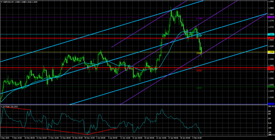 Валютная пара GBP/USD в четверг британская валюта успела потерять около 100 пунктов еще до оглашения результатов заседания Банка Англии. То ли трейдеры с самого начала ожидали самого худшего, то ли на рынок просочилась инсайдерская информация, но факт остается фактом – рынок отыграл «голубиные» результаты заседания, не зная достоверно самих результатов. В целом, Британский регулятор оставил ключевую ставку без изменений на уровне 3,75%, что полностью соответствовало прогнозам. В чем же тогда заключается «голубиность» результатов? В том, что «за» снижение ставки проголосовало не два члена Монетарного комитета, а сразу четыре. Напомним, что комитет MPC состоится из девяти чиновников, поэтому еще один голос – и было бы принято «голубиное» решение, на которое абсолютно никто из трейдеров не рассчитывал. Вчера мы говорили, что рынок будет отрабатывать результаты голосования по ставке. В этом нет никакого смысла, так как решение все равно будет принято то, которого все ждут. А в дальнейшем БА будет руководствоваться показателем инфляции при принятии решений об изменении монетарной политики. Так как инфляция на Туманном Альбионе остается не просто повышенной, а откровенно высокой, то ожидать сильного смягчения монетарной политики не стоит. И, тем не менее, Банк Англии был близок к тому, чтобы внепланово снизить ключевую ставку. Таким образом, более или менее закономерно фунт стерлингов торговался с понижением в четверг. На наш взгляд, судьба британского фунта зависит не от Банка Англии или британской экономической статистики. Она зависит от доллара. А судьба доллара зависит от Дональда Трампа и ФРС. Если ФРС потеряет свою независимость в 2026 году, то будет зависеть только от Трампа. Поэтому в любом случае позиции доллара выглядят гораздо менее привлекательно, чем перспективы британского фунта. Конечно, речь все еще идет о валюте, которой пользуется при расчетах весь мир. Она не может падать, как камень, сброшенный с обрыва, или как иранский риал. Но если говорить о долгосрочных перспективах, мы не представляем, что должно произойти, чтобы доллар начал расти. Возможно, только импичмент Трампа может повлиять на ситуацию с американской валютой позитивно. Однако попыток отстранения Трампа от власти за два президентских срока было уже несколько. Конгрессу не удалось принять решение в ходе первой каденции Трампа, когда обе палаты не были полностью республиканскими. Какова вероятность, что у него это получится сделать сейчас, когда большинство – за республиканцами в обоих палатах? Кто будет голосовать за импичмент Трампа, понимая, что вероятность отстранения президента низкая, а месть Трампа может стоить политической карьеры? Таким образом, если и ждать изменений, то только после промежуточных выборов в Парламент осенью 2026 года. Средняя волатильность пары GBP/USD за последние 5 торговых дней составляет 104 пункта. Для пары фунт/доллар это значение является «средним». В пятницу, 6 февраля, таким образом, мы ожидаем движения внутри диапазона, ограниченного уровнями 1,3439 и 1,3647. Старший канал линейной регрессии направлен вверх, что указывает на восстановление тренда. Индикатор CCI шесть раз заходил в область перепроданности за последние месяцы и сформировал огромное количество «бычьих» дивергенций, что постоянно предупреждало трейдеров о грядущем