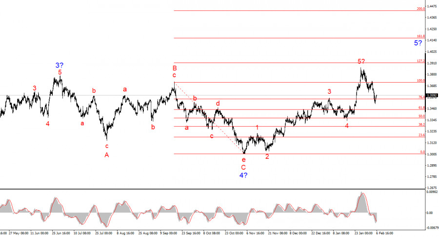 Исходя из проведенного анализа EUR/USD, я делаю вывод, что инструмент продолжает построение повышательного участка тренда. Политика Дональда Трампа и денежно-кредитная политика ФРС остаются весомыми факторами падения американской валюты в долгосрочном плане. Цели текущего участка тренда могут простираться вплоть до 25-й фигуры. На текущий момент я считаю, что началось и продолжается построение глобальной волны 5, поэтому ожидаю повышения котировок в первой половине 2026 года. Но в ближайшее время я ожидаю понижательную волну(или серию волн), так как структура a-b-c-d-e также выглядит завершенно. В ближайшее время мои читатели могут заняться поиском областей и уровней для новых покупок. Волновая картина по GBP/USD: