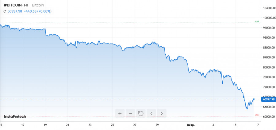 Биткоин рухнул ниже $60 000 – это минимальный уровень с октября 2024 года. Крупнейшая цифровая валюта вновь под ударом, теряя всю прибавку, полученную после победы Дональда Трампа на выборах в ноябре того же года. Инвесторы и трейдеры оказались в эпицентре «режима полной капитуляции» – так аналитики охарактеризовали последствия стремительной распродажи активов, развернувшейся на фоне снижающегося настроения на рынке.В течение четверга и пятницы распродажа цифровых активов усилилась. В результате за 24 часа Bitcoin потерял около 17% своей стоимости – это крупнейшее однодневное падение с момента развала криптобиржи FTX в ноябре 2022 года.По данным аналитической платформы Coinglass, объем ликвидаций за сутки достиг ошеломляющих $2,67 млрд. Основная часть убытков ($2,31 млрд) пришлась на длинные позиции, то есть на тех трейдеров, которые ставили на рост стоимости и использовали маржинальную торговлю. Снижение цен вынудило их ликвидировать позиции под давлением резкого обвала котировок.Обвал цен резко сказался на настроениях участников крипторынка. В пятницу индекс страха и жадности (Crypto Fear & Greed Index) обрушился до уровня 5. Это минимальный показатель с момента запуска индекса в июне 2023 года. Такой уровень указывает на «экстремальный страх», что обычно сопровождается паническими распродажами и массовым выходом инвесторов из рынка.Общая капитализация крипторынка с начала октября снизилась с $4,37 трлн до примерно $2,37 трлн. Только за последний месяц инвесторы потеряли около $800 млрд. Сокращение в размере $2 трлн с момента пика подчеркивает масштаб текущего кризиса в цифровых активах.Биткоин не единственный, кто понес потери. Ethereum, вторая по капитализации криптовалюта, опустился ниже $1900, потеряв более 13% всего за один день. С начала года ETH обесценился почти на 38%. Такая динамика свидетельствует о высокой степени обеспокоенности участников рынка и нестабильности ключевых криптоактивов.«Стремительное падение биткоина напоминает идеальный шторм», – отметил Винсент Лю, инвестиционный директор Kronos Research. Он подчеркнул, что складывающаяся ситуация – это классический пример «сворачивания кредитного плеча на фоне стремительной и эмоциональной распродажи». По его мнению, текущая динамика указывает на чрезмерные риски, допущенные на пике жадности со стороны трейдеров.Снижение цен открывает возможности для работы с короткими позициями, особенно с активами, демонстрирующими признаки слабости. Также, при формировании признаков разворота, инвесторы могут начать собирать позиции по выгодным уровням, рассчитывая на долгосрочный отскок или восстановление. Важно использовать риск-менеджмент и контролировать плечо, чтобы избежать повторения ситуаций с принудительными ликвидациями.Все рассмотренные в статье торговые инструменты, включая Bitcoin и Ethereum, доступны для торговли на платформе InstaForex. Чтобы оперативно реагировать на изменения рынка и анализировать ситуацию в режиме реального времени, трейдерам стоит открыть торговый счет в InstaForex и установить мобильное приложение компании, которое обеспечивает быстрый доступ к рынку и широкие возможности для анализа.Рынки под ударом: распродажа акций техгигантов сбила S&P 500 в минус