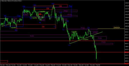 На 4-часовом таймфрейме цена также продолжает формирование нисходящей структуры. Линия CHOCH проходит на уровне 90 560$, только выше нее можно будет говорить о преобразовании тренда в восходящий. Однако на данный момент нет никаких признаков того, что биткоин может завершить падение в ближайшее время. Последний «медвежий» FVG был проигнорирован, но на текущий момент времени он еще даже не отменен. Таким образом, использовать этот сигнал в качестве сигнала для покупок мы не советуем. Сегодня сформировался «бычий» FVG, от которого можно будет открывать локальные и небольшие длинные позиции.Рекомендации по торговле BTC/USD: