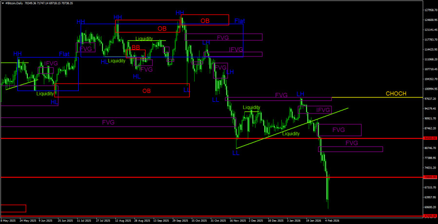 Биткоин достиг отметки 60 000$ в рамках своего очередного обвала. Тут же последовал откат на 10 000$ вверх, который следует считать банальным откупом. Часть инвесторов посчитала, что ниже 60 000$ биткоин стоить просто не может и упасть ниже он просто не может. Поэтому последовала волна покупок. Возможно, для кого-то текущие уровни действительно выглядят очень привлекательными. Возможно, биткоин действительно закончит на этом падение. Однако мы так не считаем. На текущий момент по-прежнему нет ни одного признака начала восходящего тренда или хотя бы коррекции. Лишь на 4-часовом ТФ, скорее всего, будет проигнорирован последний «медвежий» FVG. Реакция на него получена не была, поэтому коррекция может продолжится. Однако больше нет никаких сигналов о возможном среднесрочном развороте. Биткоин даже ликвидность на покупку не снял ни на одном из ТФ. Таким образом, для длинных позиций мы бы посоветовали дождаться более сильных и убедительных сигналов. Биткоин потерял больше 50% стоимости всего лишь за несколько месяцев. И хотим напомнить, что практически любой восходящий тренд по биткоину именно так и заканчивался – обвалом на 70-80%. Таким образом, текущие 50% – это еще очень мало. Нисходящий тренд длится всего лишь 4 месяца, что тоже очень мало. Мы считаем, что с паузой или без, биткоин продолжит падение в среднесрочной перспективе. Как видим, потенциальное принятие закона Clarity Act, который сделает криптовалюты более прозрачными и безопасными для инвесторов, не играет никакой роли для самих инвесторов. Как и фигура Дональда Трампа, при котором Америка должна стать мировым криптовалютным центром. Мы также не считаем, что последний обвал котировок как-то связан с фигурой Кевина Уорша, который может возглавить ФРС. Среди трейдеров сейчас существует мнение, что Уорш будет занимать «ястребиную» позицию, выступать за сокращение баланса ФРС и не поддерживать агрессивное снижение ключевой ставки. Зачем в таком случае Дональду Трампу, который хочет максимально низких ставок, назначать Уорша?