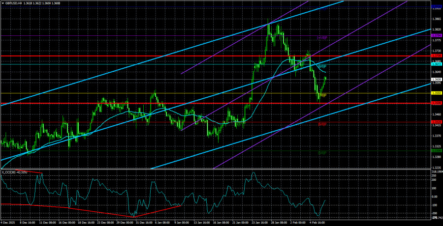 Валютная пара GBP/USD в течение пятницы активно восстанавливалась. Если евровалюта практически всю прошлую неделю простояла во флэте, то фунт довольно активно торговался. Причины для этого имелись хоть и формальные, но все же. Напомним, что Банк Англии принял ожидаемое решение сохранить параметры монетарной политики без изменений, но Эндрю Бейли предупредил о возможном ускорении инфляции в ближайшие месяцы на фоне более высоких темпов роста экономики в начале года. Несмотря на то, что в подобных обстоятельствах было бы более логичным оставить ключевую ставку без изменений, Монетарный комитет принял соответствующее решение с перевесом всего лишь в один голос. Именно такой минимальный перевес условных «ястребов» сыграл злую шутку с британским фунтом. Однако в пятницу британская валюта начала восстанавливаться, так как рынок осознал простую вещь – на следующем заседании БА решение вновь будет приниматься на основании инфляции. Поэтому результаты голосования в начале февраля не означают «голубиный» настрой регулятора. С технической точки зрения, мы увидели на 4-часовом ТФ хорошую, сильную коррекцию после роста на 500 пунктов. Эта коррекция имеет классический вид, состоящий из трех волн. Таким образом, мы допускаем, что коррекция завершена, а британский фунт может возобновить свой поход на Север. В последнее время с полос газет и интернет-изданий исчезли заголовки, связанные с Дональдом Трампом. Американский президент из-за «дела Эпштейна» занят сейчас отмыванием своего доброго имени, а не новыми угрозами, тарифами, санкциями и ударами по Ирану. Также лидер США начал задумываться о промежуточных выборах в Палату представителей и Сенат, которые пройдут в ноябре. Понимая, что большая часть американцев недовольна своим президентом(интересно, почему, если экономика растет?), Трамп уже готовит различные методы воздействия на электорат. В частности, чтобы расположить к себе разгневанный действиями ICE и общей политикой страны Трамп собирается раздать очередные «вертолетные» 2 000$. Ну а почему бы и нет, если экономика растет беспрецедентными темпами? Различные экзит-полы, которые уже начали проводиться в Америке, показывают, что, как минимум, одну палату республиканцы могут потерять. При наихудших(но вполне реалистичных) раскладах – обе. Политический рейтинг Трамп обвалился до 29%. Таким образом, в следующие 8-9 месяцев одиозному республиканцу нужно срочно расположить к себе американский народ. Эксперты считают, что именно по этой причине Трамп отказался от захвата Гренландии, а в последнее время не вводит новых тарифов. Что ж, остается только рассуждать на тему, достаточно ли 2 000$, чтобы купить американский народ на выборах. Средняя волатильность пары GBP/USD за последние 5 торговых дней составляет 100 пунктов. Для пары фунт/доллар это значение является «средним». В понедельник, 9 февраля, таким образом, мы ожидаем движения внутри диапазона, ограниченного уровнями 1,3508 и 1,3708. Старший канал линейной регрессии направлен вверх, что указывает на восстановление тренда. Индикатор CCI шесть раз заходил в область перепроданности за последние месяцы и сформировал огромное количество «бычьих» дивергенций, что постоянно предупреждало трейдеров о грядущем возобновлении восходящего тренда. Заход в область перекупленности предупредил о начале корре