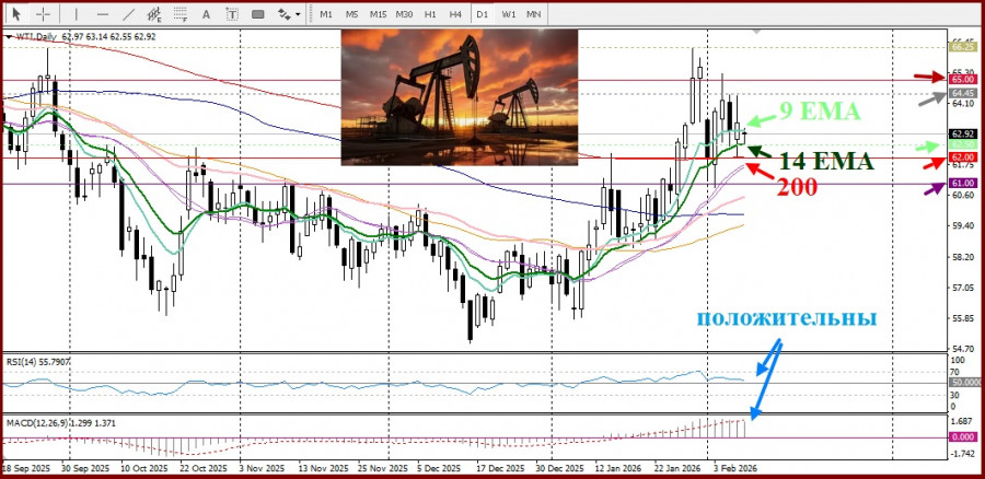 Одновременно уже через несколько часов после завершения косвенных переговоров США объявили о введении дополнительных санкций в отношении иранского нефтяного и нефтехимического экспорта, что ограничивает масштаб снижения цен и сдерживает чрезмерный оптимизм участников рынка. Дополнительную поддержку котировкам оказывает и общее ослабление доллара США, традиционно играющее в пользу долларовых товарных активов и стимулирующее спрос на нефть вблизи области 62,00 долларов за баррель, где проходит 200-дневная SMA.