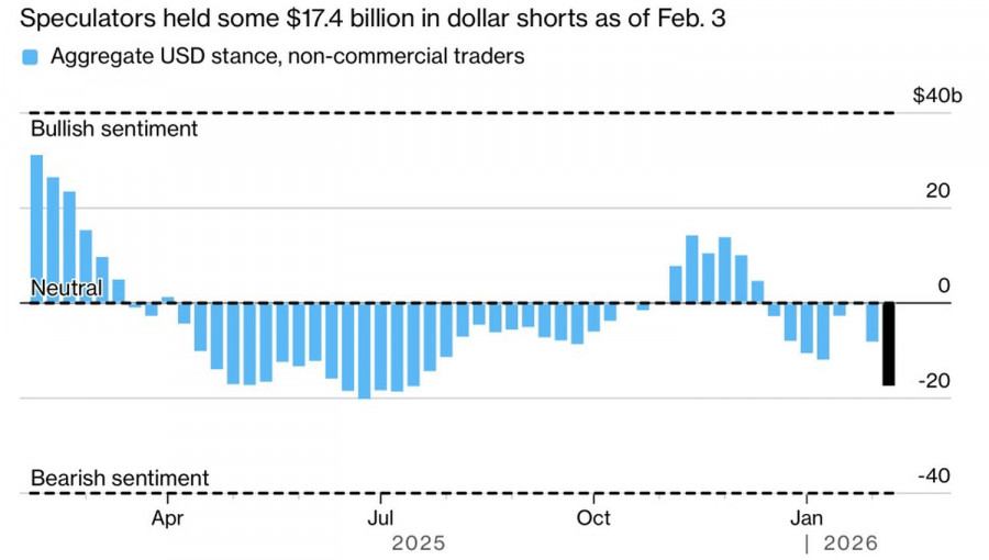 Динамика запасов трежерис у КитаяКитай владеет казначейскими облигациями США на сумму в $682,6 млрд, что является самым низким уровнем с 2008. На пике в 2013 эти активы доходили до $1,32 трлн. Их величина постоянно сокращается. Тем не менее Бельгия, где Пекин имеет инвестиционные счета, увеличила запасы трежерис в четыре раза с 2017 до $481 млрд. Если бы Поднебесная решила сбросить с рук все государственные облигации США сразу, это стало бы серьезным потрясением для финансовых рынков. Китай предпочитает топить Соединенные Штаты медленно, но верно. Его указания банкам связаны с намерением ограничить растущий риск неопределенности политики Белого дома. Если за Пекином, Бразилиа и Дели последуют остальные, американцам будет крайне тяжело найти покупателей на их колоссальный долг. Это грозит дефолтом и утратой долларом США статуса основного резервного актива. Стоит ли удивляться ралли EUR/USD?По мнению Bank of America, долгосрочные перспективы доллара США остаются «медвежьими», однако пока инвесторы убирают из своих тетрадей словосочетания «потеря авторитета» и «продай Америку», гринбэк может поправить свое положение. История с Китаем говорит, что это не так. Основная валютная пара определилась с дорогой. Остался лишь вопрос по скорости ралли. Это прекрасно понимают спекулянты, которые не устают наращивать короткие позиции по американской валюте. На неделе к 3 февраля нетто-шорты достигли максимального уровня с июля. Однако пока еще позиция не является экстремальной, индексу USD есть куда падать. Динамика позиций хедж-фондов и управляющих активами по доллару США