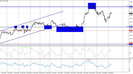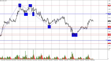 На часовом графике пара GBP/USD в понедельник выполнила закрепление над зоной 1,3595–1,3620 и продолжила процесс роста в направлении следующего коррекционного уровня 161,8% – 1,3755. Сегодня отбой от уровня 1,3755 может сработать в пользу американской валюты и некоторого падения пары. Закрепление котировок над уровнем 1,3755 повысит вероятность дальнейшего роста в направлении уровня 1,3845.