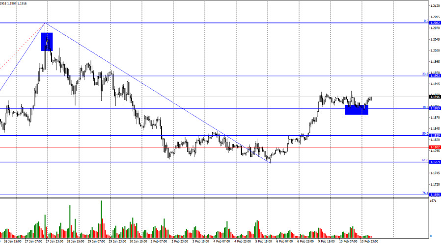 Ситуация с волнами на часовом графике остается простой. Последняя завершенная волна вниз не пробила лоу предыдущей волны, а новая волна вверх пока не пробила предыдущий лоу. Таким образом, тренд остается «бычьим». Быки взяли небольшую паузу в рамках масштабного наступления, которое было бы невозможно без Дональда Трампа. Трамп накалил обстановку в мире и внутри США до предела, а рынки продолжают реагировать бегством от опасной американской валюты с неопределенными экономическими перспективами. Во вторник информационный фон в США и ЕС не привлек внимания трейдеров. Отчет по изменению объемов розничной торговли показал отсутствие каких-либо изменений в декабре, хотя трейдеры ожидали небольшого прироста. Отчет ADP за неделю показал прирост 6,5 тысяч новых сотрудников, что в месячном варианте дает как раз около +25 тысяч, о которых сообщил нам январский отчет ADP на прошлой неделе. Таким образом, еще один отчет по рынку труда показал слабое значение, но для трейдеров особое значение имеет отчет Nonfarm Payrolls, который выйдет сегодня в паре с уровнем безработицы. На данный момент трейдеры-быки удерживают выигрышные для себя позиции и сохраняют тренд. Сегодня только очень сильные данные по рынку труда заставят их отступить с рынка. Поддержку евровалюте оказывает уровень 1,1889. На мой взгляд, вероятность слабых значений пэйроллсов и безработицы выше, чем сильных. Таким образом, я ожидаю сегодня нового падения доллара и роста пары EUR/USD.