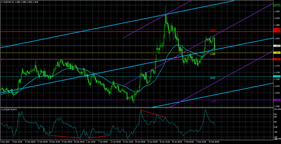 Валютная пара EUR/USD в среду торговалась очень спокойно до момента публикации NonFarm Payrolls и уровня безработице. В принципе, в этом нет ничего удивительного, так как этих отчетов рынок ждал еще на прошлой неделе. А вместо Нонфармов и безработицы ему пришлось довольствоваться ADP, JOLTs и стандартными заявками на пособия по безработице. К слову, все три отчета провалились, лишь подлив масла в огонь костра, на котором доллар жарится уже больше года. Несмотря на сильный рост ВВП, все больше экспертов обращает внимание на искусственный характер такого роста. Напомним, что несколько дней назад Дональд Трамп заявил, что ждет от Кевина Уорша ускорения экономики до 15%. Многие восприняли это заявление, как шутку, но очевидно, куда метит Трамп. Он хочет разогнать экономику США еще сильнее. Какими способами и методами? Эксперты отмечают, что реальная покупательная способность американского населения падает. Ранее мы уже отмечали, что официальная инфляция остается достаточно низкой, но цены все равно растут, что отмечают многие американские потребители. Вот и получается парадокс. Экономика растет, но покупательная способность падает, нагрузка на домохозяйства возрастает, количество недовольных политикой Трампа растет по экспоненте. Отдельно следует отметить многострадальный рынок труда США. Спад виден невооруженным глазом. А рынок труда – это основа любой экономики. Если население не имеет возможности устроиться на работу, то не может оплачивать кредиты, совершать покупки, проходить лечение, оплачивать услуги. И опять-таки на бумаге все выглядит не так уж плохо. Безработица составляет всего 4,4%, а рынок труда худо-бедно создает рабочие места. Но почему тогда все больше американцев отмечает факт невозможности трудоустроиться и выходит на митинги/протесты? Мы предлагаем анализировать ситуацию, сложившуюся вокруг доллара и Америки, не по отдельным отчетам, а в общем и целом. Отдельные макроэкономические публикации могут поддерживать американскую валюту просто потому, что прогнозные значения были превышены. Мы уже отмечали этот экономический парадокс ранее. Если условно по отчету NonFarm Payroll прогноз составляет 20 тысяч, а фактическое значение выходит на уровне 30 тысяч, то получается, что дела обстоят лучше, чем ожидал рынок, и доллар растет. Но практически все трейдеры и экономисты понимают, что даже 50 тысяч новых рабочих мест в месяц – это крайне мало и недостаточно для того, чтобы безработица не увеличивалась. На наш взгляд, лучше всего сейчас иллюстрирует происходящее технический анализ. Посмотрите на дневной ТФ. С момента, когда Дональд Трамп стал президентом во второй раз, доллар либо падает, либо(в лучшем для него случае) стоит на месте. То есть ни о каком ощутимом росте против европейской валюты(наиболее весомого конкурента) даже речи не идет в последние 13 месяцев. И мы по-прежнему не видим, за счет чего американской валюте рассчитывать на рост, если даже Трамп откровенно радуется ее падению. Средняя волатильность валютной пары EUR/USD за последние 5 торговых дней по состоянию на 12 февраля составляет 72 пункта и характеризуется, как «средняя». Мы ожидаем движение пары между уровнями 1,1807 и 1,1951 в четверг. Старший канал линейной регрессии направлен вверх, что указывает на дальнейший рост евровалюты. Индикатор CCI заходил в область перекупленности, чт