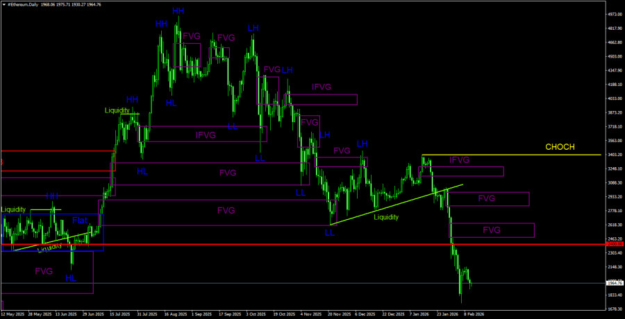 Биткоин продолжает формирование полноценного нисходящего тренда. Мы продолжаем ожидать падения с целью 57 500$(уровень 61,8% по Фибоначчи от трехлетнего восходящего тренда), а признаков разворота тренда в данное время ни одного. Но даже уровень 57 500$ теперь не выглядит, как конечная остановка. Из областей POI на продажу на дневном ТФ можно отметить последний «медвежий» FVG, до которого биткоину еще очень далеко. На 4-часовом ТФ также имеется «медвежий» FVG. Реакция на любой из этих FVG + подтверждение на ТФ младше на два ранга = возможность открытия новых шортов.Рекомендации по торговле ETH/USD: