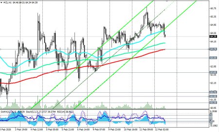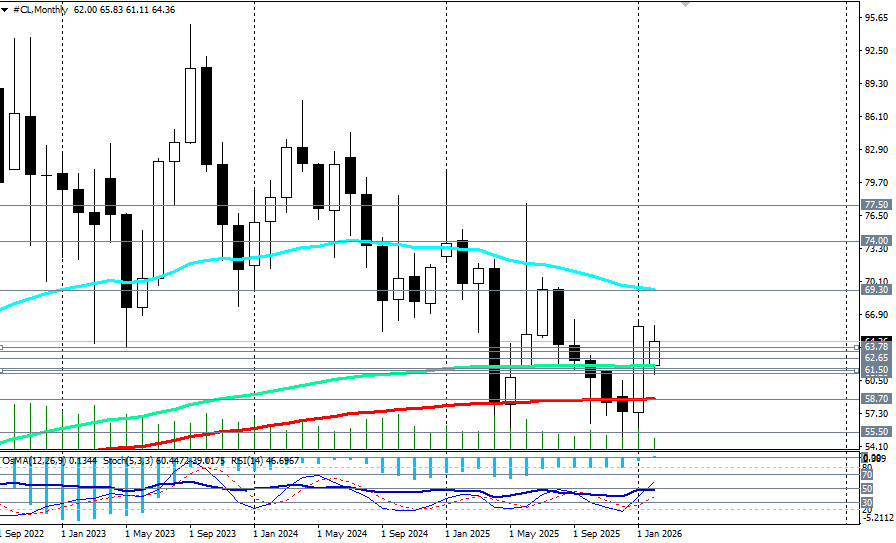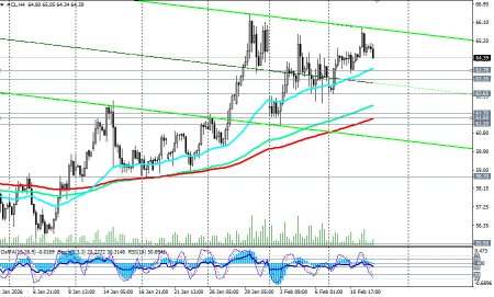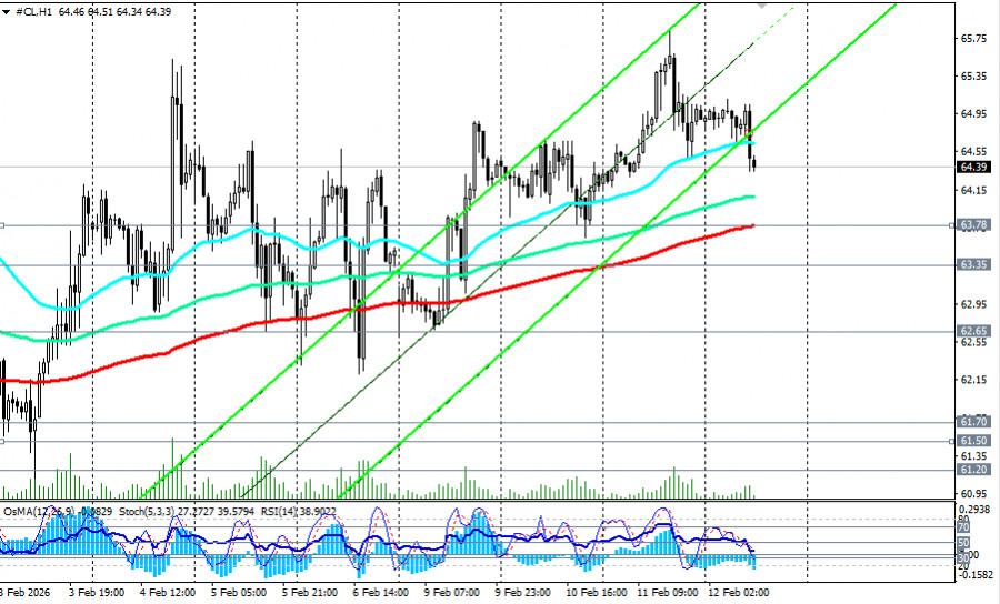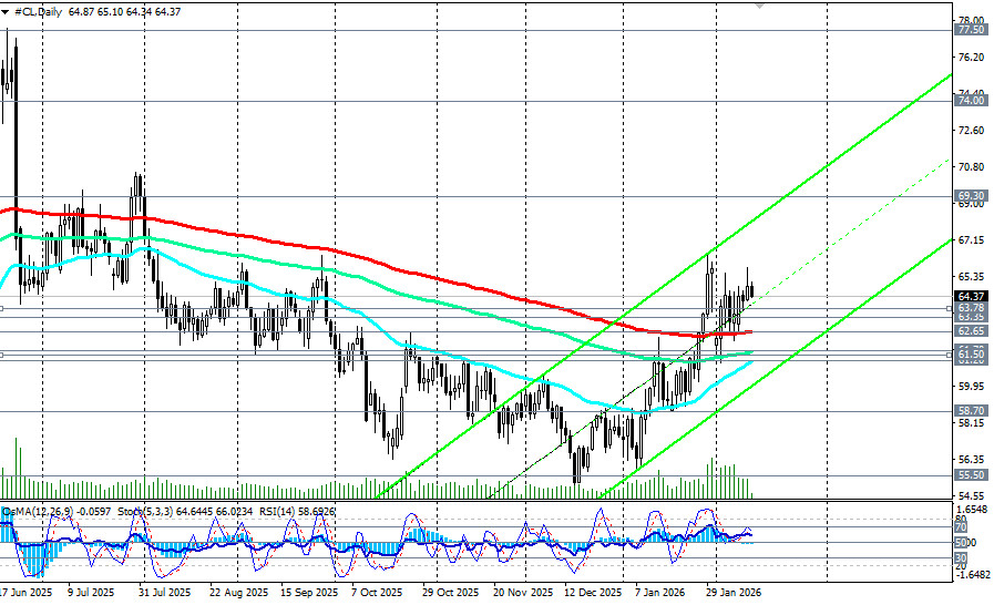 В настоящий момент рынок нефти вступил в фазу противостояния двух противоположных сил. С одной стороны, на котировки давит мощнейший за последние месяцы рост запасов в США. С другой – эскалация напряженности между США и Ираном удерживает цены от обвала, создавая «геополитическую подушку». В результате WTI балансирует в районе 64.00–66.00, а инвесторы гадают, какой из факторов возьмет верх, отметили мы в нашем сегодняшнем фундаментальном анализе и обзоре «Нефть WTI: рекордные запасы против ультиматума». Устойчивый пробой выше 65.00–66.00 потребует дальнейшей эскалации конфликта, а также резкого сокращения запасов в США. Любая же деэскалация и сохранение высокого уровня запасов или их рост, напротив, мгновенно спровоцирует фиксацию прибыли с откатом к 60.00 (район 200-периодной месячной ЕМА) – 61.00 (район ЕМА50 на дневном графике цены). С технической же точки зрения фьючерсы на нефть марки WTI (CL в торговом терминале) остаются торговаться в восходящем канале, сформированном на дневном графике с начала года, а общий среднесрочный тренд остаётся умеренно восходящим. 1. Базовый сценарий (сохранение статус-кво). WTI останется в диапазоне 62.00–66.00. Геополитическая премия будет компенсировать рост запасов, а ОПЕК+ сохранит гибкость в ожидании прояснения иранского вопроса. Это наиболее вероятный сценарий на февраль и март. 2. Бычий сценарий (эскалация) реализуется при срыве переговоров и активизации военных приготовлений США. Любая реальная угроза иранскому экспорту (до 1,6–1,7 млн б/с — критический объем для рынка) способна мгновенно поднять WTI в зону 70.00+. Уровень 69.30 в этом случае будет пробит, открывая дорогу к 71.00–74.00 и, возможно, выше. Первым сигналом здесь может стать пробой сегодняшнего максимума 65.10. 3. Медвежий сценарий (деэскалация) возможен в случае достижения договоренностей или переноса активной фазы давления на Иран на неопределенный срок. В этом случае рынок сфокусируется на рекордных запасах и предупреждениях IEA о глобальном избытке предложения. Цель – тестирование 60.00 и, при пробитии, движение к 59.00–58.50. Самым ранним сигналом для начала реализации данного сценария может стать пробой сегодняшнего «лоу» 64.18, а подтверждающим – пробой уровней поддержки 63.78 (ЕМА200 на 1-часовом графике цены) и 63.35 (ЕМА50 на недельном графике). Пробой ключевого уровня поддержки 62.65 (ЕМА200 на дневном графике) усилит негативный импульс и выведет цену в зону среднесрочного медвежьего рынка. Отметим, что ниже ключевого уровня сопротивления 69.30 (ЕМА200 на недельном графике) цена на фьючерсы нефти WTI (CL в терминале) двигается в зоне долгосрочного медвежьего рынка. Ключевые уровни сопротивления