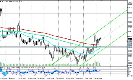 66.00 – психологический барьер, требующий подтверждения эскалацией конфликта. Его пробой может спровоцировать рост в сторону 200-недельной скользящей средней, проходящей в зоне 69.00–69.30