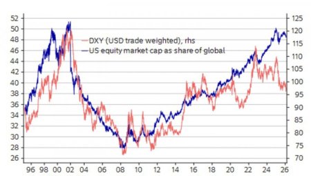 Белый дом утверждает, что тарифы и ослабление денежно-кредитной политики ФРС работают на благо экономики США. Дескать, при Кевине Уорше она может разогнаться до 15%. Однако как только во главу угла становятся интересы власти, начинается уход от прежних высказываний. Согласно инсайду Bloomberg, американская администрация работает над корректировкой 50%-х пошлин на импорт алюминия и стали. Вполне вероятно, они будут снижены. За несколько месяцев до промежуточных выборов такое решение выглядит как чистая политика. С фундаментальной точки зрения доллар США выглядит предпочтительнее евро, по меньшей мере на горизонте инвестирования в один квартал. Это связано с намерением ФРС удерживать ставки до июня, ЕЦБ – до конца 2026. Их дифференциал говорит о большей привлекательности американских активов по сравнению с европейскими. В теории это должно способствовать переливу капитала из Старого в Новый Свет и приводить к падению евро. Однако политика Дональда Трампа заставляет инвесторов пересмотреть свои взгляды. Они вдруг увидели, что американский рынок акций составляет около 50% от общемирового, а экономика США – только 26% от глобального ВВП. Пришло понимание, что в портфелях слишком много эмитированных в Соединенных Штатах активов. Динамика доллара и доли рынка акций США в мировой капитализацииНеопределенность политики Белого дома запускает процессы «продай Америку» и «хеджируй Америку». При этом активное противодействие действиям Дональда Трампа еще больше усиливает страхи инвесторов. Несколько республиканцев Палаты представителей присоединились к демократам, чтобы признать тарифы в отношении Канады незаконными. Документ поступил в Сенат, если он будет одобрен, отправится на подпись президенту. Тот наверняка наложит вето. Но сам факт, что он не так контролирует Конгресс, как прежде, заставляет инвесторов задуматься. Таким образом, складывается ситуация, когда экономика работает на гринбэк, а политика против него. Разница в ставках велика, однако можно подвести лошадь к воде, но нельзя заставить ее пить. Bank of America отмечает, что инвесторы с начала года вложили $104 млрд в ориентированные на Европу, Японию и другие развитые региона мира фонды. Американские ETF привлекли куда более скромные деньги – $25 млрд.