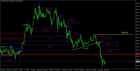 Эфир на дневном ТФ продолжает формирование нисходящей тенденции. В начале нового витка падения по эфиру не было сформировано сигналов на продажу, но был сформирован нужный сигнал по биткоину, который можно было использовать и для эфира. В данное время на дневном ТФ имеется три «медвежьих» паттерна, все – FVG. В будущем от них можно рассматривать новые короткие позиции. Ближайший находится в области 2 480$ – 2 630$, и именно он представляет особый интерес. Линия CHOCH проходит по уровню 3 395$ – последний LH(Lower High). До тех пор, пока цена находится ниже нее, нисходящий тренд сохраняется. Если сейчас начинается коррекция, она может быть долгой.Анализ ETH/USD 4Н.