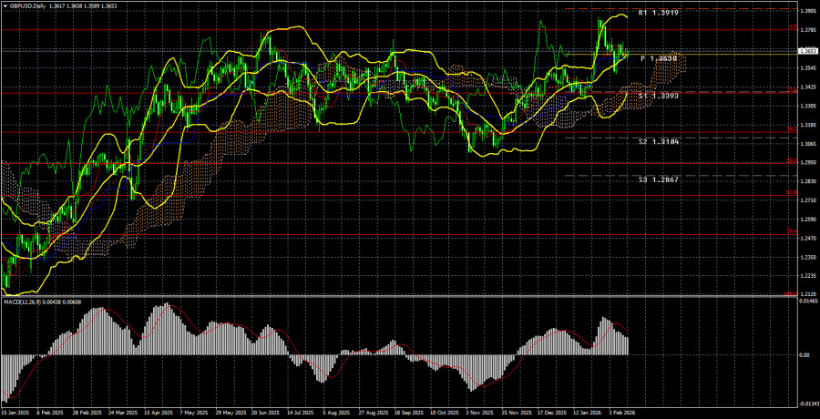 Валютная пара GBP/USD в течение текущей недели также не показал каких-либо умопомрачительных движений. В целом можно сказать, что ожидания в начале недели были высокими, но они не оправдались. Не оправдались по целому ряду причин. Мы неоднократно говорили о том, что макроэкономическая статистика – это важная составляющая прогнозирования движений любой валюты, но в то же время она очень часто бывает противоречивой и неоднозначной. Таким образом, в моменте даже рынок не всегда отрабатывает его логично и закономерно. На основании одних и тех же цифр разные трейдеры могут сделать разные выводы. Вероятно, так случилось и на этой неделе. Конечно, ключевым отчетом минувшей недели является NonFarm Payrolls. В чем заключались ожидания рынка? После провала отчетов JOLTs и ADP трейдеры ожидали 50-70 тысяч новых рабочих мест по итогам января в лучшем случае. И противоречия начинаются именно в этот момент. Прежде всего стоит заметить, что даже 70 тысяч рабочих мест – это очень мало для американской экономики. Нормальным является значение 150-200 тысяч в месяц, о чем американский рынок труда может сейчас только мечтать. Таким образом, любое значение ниже 150-200 тысяч в месяц априори не является позитивным, свидетельствующим о позитивных тенденциях. По итогу в январе было создано 130 тысяч Нонфармов, что гораздо выше прогнозов, но при этом все равно не очень много. Когда трейдеры увидели эту цифру, примерно на час их захлестнула эйфория, доллар устремился вверх, однако в то же время стало известно, что общее количество рабочих мест в 2025 году было снижено «всего лишь» на 400 тысяч. Согласно переоценке Бюро статистики, всего в 2025 году было создано порядка 180 тысяч мест(в январе 2026 года – 130 тысяч). И как в этом случае следовало трактовать январское значение NonFarm Payrolls? С одной стороны, можно посчитать, что рынок труда все же восстанавливается, благодаря трем снижениям ключевой ставки ФРС, и дальше дела пойдут лучше. С другой стороны, где гарантия, что январский прирост – это не единичный случай? Где гарантия, что уже в следующем месяце или в конце 2026 года Бюро статистики не пересмотрит текущие данные на десятки и сотни тысяч в сторону уменьшения? Мы бы сказали, что в 2025 году доверие к статистической информации из-за океана сильно снизилось. Данные по безработице и рынку труда постоянно пересматриваются или же просто противоречат друг другу. Например, отчет ADP показывает всего 20 тысяч новых рабочих мест, Нонфармы – 130 тысяч, количество вакансий JOLTs падает на 0,7 миллиона, а уровень безработицы снижается до 4,3%... Таким образом, на наш взгляд, рынок сейчас находится в полном непонимании происходящего. Трейдеры не понимают, как относится к цифрам, которые являются оптимистичными в январе, но в то же время свидетельствуют о тотальном провале в 2025 году. На наш взгляд, в подобных ситуациях нужно обращаться за помощью к техническому анализу. На дневном ТФ прекрасно виден восходящий тренд, который не вызывает никаких сомнений. Мы ожидаем его сохранения и еще большего падения доллара. Средняя волатильность пары GBP/USD за последние 5 торговых дней составляет 83 пункта. Для пары фунт/доллар это значение является «средним». В понедельник, 16 февраля, таким образом, мы ожидаем движения внутри диапазона, ограниченного уровнями 1,3570 и 1,3736. Старший канал линейной регрессии направлен вверх, что указыв