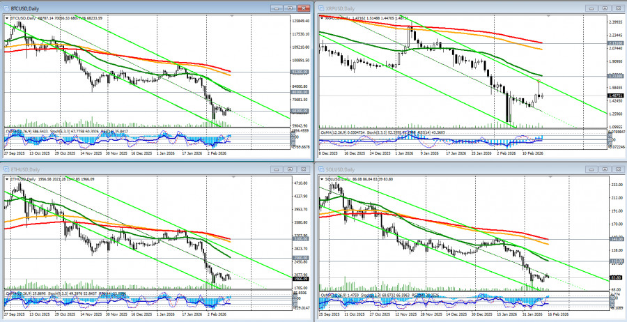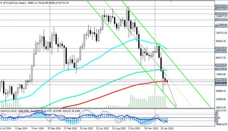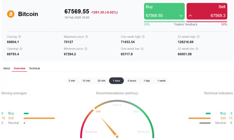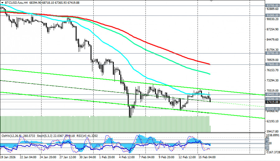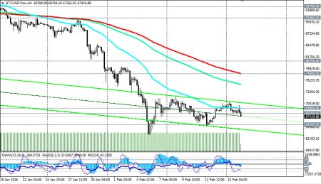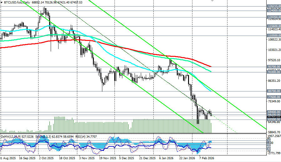 *) см. также: Торговые индикаторы InstaForex по BTC[/i] Настроения на рынке остаются крайне негативными, несмотря на, казалось бы, позитивные макроэкономические новости. На прошлой неделе в США были опубликованы ключевые данные по инфляции. Индекс потребительских цен (CPI) за январь показал замедление роста до 2,4% в годовом исчислении (против прогноза в 2,5%), а базовый CPI снизился до 2,5% (см. также наш сегодняшний обзор «[i]Доллар: в состоянии хрупкого равновесия»). Это усилило ожидания рынка как минимум двух снижений процентной ставки Федеральной резервной системой (ФРС) США в 2026 году. Технически это позитивный фактор для рисковых активов, включая криптовалюты. Однако рынок отреагировал краткосрочным ростом, который не смог закрепиться выше сопротивления в зоне 70000.00–71000.00. Экономисты связывают это с избирательным спросом и общей оборонительной позицией инвесторов. Факторы давления Разочарование в «цифровом золоте». Ключевой проблемой остается неспособность биткоина выполнять функцию защитного актива. В условиях сохранения геополитических рисков (например, потенциальной эскалации вокруг Ирана) инвесторы по-прежнему предпочитают традиционные драгоценные металлы, такие как золото. Регуляторная неопределенность. Задержки с принятием всеобъемлющего закона о регулировании крипторынка (Закон CLARITY) в США усиливают нервозность институциональных инвесторов. Дебаты вокруг регулирования стейблкоинов и неясные правила игры отпугивают крупный капитал. Ликвидации и отток из ETF. За последнюю неделю было ликвидировано на более 1.9 млрд долларов позиций с использованием кредитного плеча. Продолжающийся отток из спотовых биткоин- и Ethereum-ETF подтверждает слабость спроса как со стороны розничных инвесторов, так и институционалов. Техническая картина Обращаясь к динамике крипторынка в целом, отметим, что торги проходят в рамках среднесрочной нисходящей тенденции при поддержке монетарных факторов. Прошедшая неделя стала сложной для пары BTC/USD, демонстрирующей нестабильность курса. После снижения к отметкам вблизи уровня 65100.00, цена восстановилась сегодня до уровня 70000.00, однако вскоре вновь вернулась к падению вследствие давления внешних факторов. Ситуация остается неопределенной, с признаками как возможной консолидации, так и углубления падения. BTC/USD консолидируется в узком канале 65000.00–72000.00. Ключевая поддержка находится в зоне 68000.00–68200.00 (ЕМА200 на недельном графике). Если она не устоит, следующей целью станет зона 65000.00–67000.00, а затем и 60000.00, которую можно рассматривать как важный психологический рубеж. Сопротивление остается на 70000.00–71500.00, и только уверенный пробой выше 72000.00 может открыть дорогу к 76000.00 (ЕМА144 на недельном графике) – 80000.00. Индекс относительной силы (RSI) на недельных графиках BTC/USD впервые с 2022 года ушел в зону перепроданности (ниже 30), что можно расценивать как сигнал к возможной стабилизации (с технической точки зрения). Мнения участников крипторынка относительно будущего биткоина разделились, формируя широкий диапазон возможных сценариев на 2026 год. Базовый сценарий (консолидация). 2026 год станет периодом «дисциплины и управления риском», а не годом гарантированного быстрого роста. При сохранении текущих трендов и отсутствии макроэкономических шоков биткоин может торговаться в диапазоне 85000.00–120000.00. Негативный сценарий (углубл