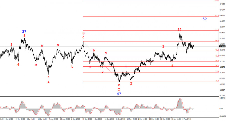 Исходя из проведенного анализа EUR/USD, я делаю вывод, что инструмент продолжает построение повышательного участка тренда. Политика Дональда Трампа и денежно-кредитная политика ФРС остаются весомыми факторами падения американской валюты в долгосрочном плане. Цели текущего участка тренда могут простираться вплоть до 25-й фигуры. На текущий момент я считаю, что инструмент остается в рамках глобальной волны 5, поэтому ожидаю повышения котировок в первой половине 2026 года. Но в ближайшее время инструмент может построить еще одну понижательную волну в рамках коррекции. Я считаю, что сейчас целесообразно заниматься поиском областей и уровней для новых покупок с целями, расположенными около отметок 1,2195 и 1,2367, что приравнивается к 161,8% и 200,0% по Фибоначчи. Волновая картина по GBP/USD: