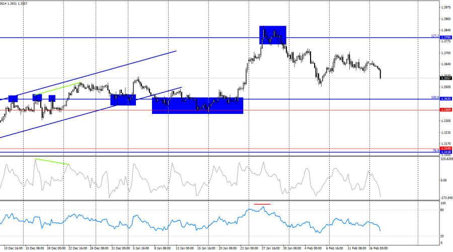 Ситуация с волнами остается «медвежьей». Последняя завершенная волна вниз пробила предыдущий лоу, а последняя волна вверх не пробила предыдущий пик. Для смены тренда обратно на «бычий» требуется закрепление выше последнего пика – 1,3730 или две «бычьи» волны подряд. Информационный фон для британца был слаб в последние месяцы, но информационный фон в Америке тоже редко по-настоящему радует трейдеров. Быкам регулярно оказывает поддержку Дональд Трамп и слабость рынка труда США. Информационный фон в понедельник отсутствовал в Великобритании, а в Америке отмечался праздник – День президента. Нет, это не День рождения Дональда Трампа. Сегодня утром в Британии вышло несколько важных отчетов, но трейдерам-медведям хватило лишь одного – уровня безработицы, который неожиданно вырос до 5,2%. На отчеты по заработным платам и заявкам на пособия по безработице внимания уже никто не обратил. Британец вновь рухнул вниз, а мы получаем новое подтверждение пассивности быков. Напомню, что на прошлой неделе быки имели все основания атаковать и на основании данных Nonfarm Payrolls за весь 2025 год, и на основании отчета по инфляции за январь. Но предоставленной возможностью они не захотели воспользоваться. Именно – не захотели. Таким образом, медведи продолжают атаковать в данное время лишь потому, что быки не хотят предпринимать никаких активных действий.