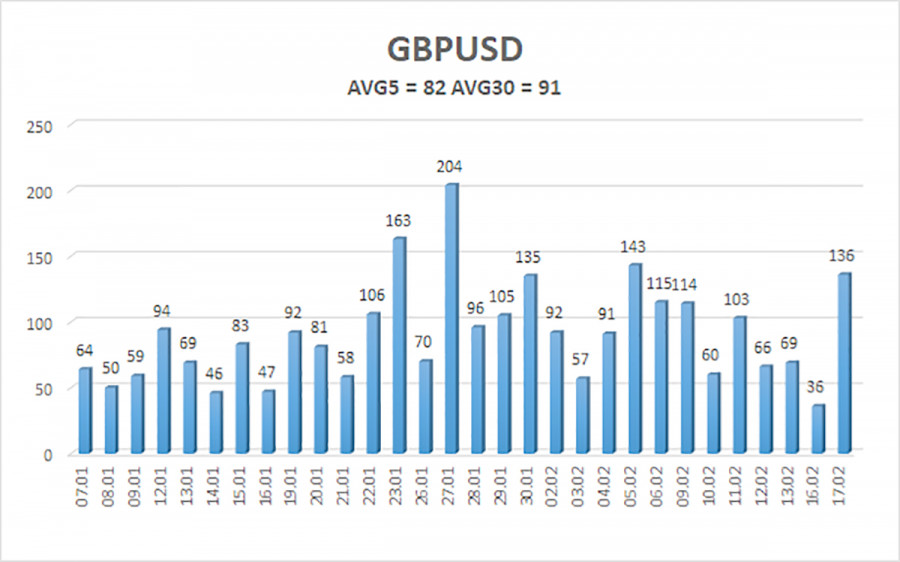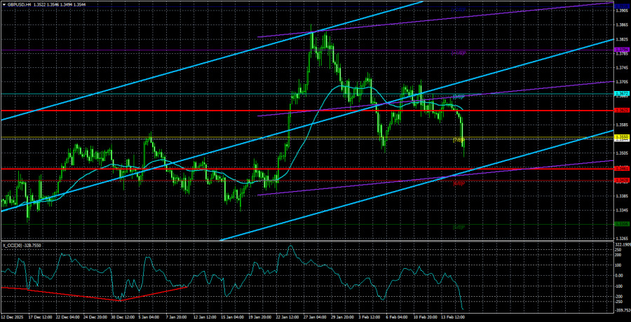 Валютная пара GBP/USD в течение среды торговалась с понижением и чуть более активно, чем в предыдущие несколько дней. Объясняется это легко и просто. Утром на Туманном Альбионе был опубликован отчет по безработице, который провозгласил рост показателя до 5,2%. Сказать честно, мы не ожидали, что реакция на британские макроэкономические данные будет такой бурной. В то же время и рынок не ожидал, что британская безработица вновь вырастет. Таким образом, один-единственный отчет вновь создал проблемы британской валюте, которая только-только настроилась на новый виток глобального восходящего тренда... Тем временем, поступила информация о сомнениях рынка в целесообразности сильного смягчения монетарной политики ФРС в текущем году. Сообщается, что различные хедж-фонды сокращают короткие позиции по доллару, в надежде на то, что американская экономика и дальше будет демонстрировать высокие темпы роста, а рынок труда наконец-то начал воскресать. Также эксперты обращают внимание на устойчивый характер базовой инфляции, при котором дальнейшее снижение ключевой ставки нецелесообразно. При чем многие эксперты отмечают, что ситуация в любой момент может повернуть в любую сторону. Укрепление доллара США на фоне снижения «голубиных» настроений рынка может привести к новой критике ФРС Дональда Трампа. И с мая-месяца с новым председателем ФедРезерва Кевином Уоршем Трамп может вновь начать требовать снизить ключевую ставку до минимальных значений. Если инфляция в Америке продолжит снижать, как в последние 5 месяцев, то ФРС уже сейчас стоит задуматься о продолжении программы снижения ставок, так как в противном случае существует риск снижения инфляции ниже целевого уровня. Однако основной фактор снижения «голубиных» ожиданий заключается именно в рынке труда США. Многие участники рынка воспряли духом, увидев январский отчет NonFarm Payrolls, подкрепленный снижением уровня безработицы. На наш взгляд, оба этих отчета уже в следующем месяце могут быть пересмотрены не в лучшую сторону, что неоднократно случалось с американской статистикой в последние полгода. Также мы не можем закрыть глаза на данные по Нонфармам за 2025 год, которые были пересмотрены в разрезе каждого месяца до мизерных значений. На наш взгляд, рынок вновь малодушничает и относится к доллару слишком позитивно «за былые заслуги». На дневном ТФ пара GBP/USD может уйти ниже критической линии, и это будет очень плохо для перспектив британского фунта. После роста пары от 1,3000 до 1,3860, конечно, нужна коррекция, и мы считаем, что именно коррекцию мы сейчас и наблюдаем. Да, она затягивается, получается более сложной, но на том же дневном ТФ отлично видно, что на самом деле коррекция к текущему моменту не такая уж внушительная. Мы считаем, что британская валюта перед новым ростом вполне может опуститься к уровню 1,3400. Средняя волатильность пары GBP/USD за последние 5 торговых дней составляет 82 пункта. Для пары фунт/доллар это значение является «средним». В среду, 18 февраля, таким образом, мы ожидаем движения внутри диапазона, ограниченного уровнями 1,3461 и 1,3625. Старший канал линейной регрессии направлен вверх, что указывает на восстановление тренда. Индикатор CCI зашел в область перепроданности, что предупреждает о возможном завершении коррекции. Ближайшие уровни поддержки: S1 – 1,3428 S2 – 1,3306 S3 – 1,3184 Ближайшие у