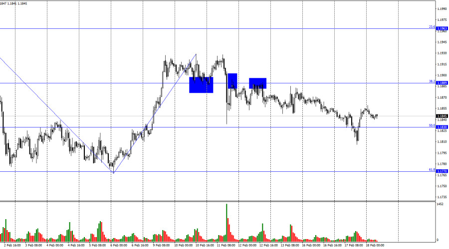 Ситуация с волнами на часовом графике остается простой. Последняя завершенная волна вверх не пробила пик предыдущей волны, а новая волна вниз не пробила предыдущий лоу. Таким образом, тренд остается «бычьим». Быки взяли небольшую паузу в рамках масштабного наступления, которое было бы невозможно без Дональда Трампа. Трамп накалил обстановку в мире и внутри США до предела, а рынки продолжают реагировать бегством от опасной американской валюты с неопределенными экономическими перспективами. Во вторник информационный фон был достаточно слабым. Трейдеры не обратили никакого внимания на инфляцию в Германии, а индексы экономических настроений института ZEW отработали лишь формально. Во второй половине дня в США вышел отчет ADP в недельной вариации, но трейдеры далеко не всегда реагируют даже на месячные отчеты ADP, отдавая предпочтение Nonfarm Payrolls и уровню безработицы. Таким образом, европейская и американская статистика практически никакого влияния на движения пары не оказала. Во второй половине дня стало известно о втором раунде переговоров между США и Ираном, который состоялся в Женеве. По итогам встречи иранских и американских делегаций можно сказать, что некий прогресс достигнут. Тегеран согласился остановить программу обогащения урана на 3 года, а также позволить вывезти из страны часть уже обогащенного ядерного топлива. На мой взгляд, прогресс очень слабый, так как Вашингтон требует полного ядерного разоружения. Реакция Дональда Трампа на переговоры в Женеве пока неизвестна. Тем не менее это все же шаг в направлении деэскалации конфликта.На 4-часовом графике пара выполнила отбой от уровня коррекции 100,0% – 1,1919 и падение к уровню Фибо 76,4% – 1,1813. Отбой котировок от уровня 1,1813 сработает в пользу европейской валюты и роста обратно в направлении уровня 1,1919. Закрепление курса пары под уровнем 1,1813 позволит трейдерам рассчитывать на продолжение падения в направлении уровней 1,1748 и 1,1694. Назревающих дивергенций сегодня не наблюдается ни у одного индикатора. Отчет Commitments of Traders (COT):В течение последней отчетной недели профессиональные игроки открыли 16403 Long-контракта и закрыли 541 контракт Short. Настроение группы «Non-commercial» остается «бычьим» благодаря Дональду Трампу и его политике, и только усиливается с течением времени. Общее количество контрактов Long, сосредоточенных на руках спекулянтов, теперь составляет 319 тысяч, а контрактов Short – 138 тысяч. Это более, чем двукратное преимущество быков. Тридцать три недели подряд крупные игроки избавлялись от Short-позиций и наращивали Long. Затем начался «шатдаун», но сейчас мы наблюдаем ту же самую картину: профессиональные трейдеры продолжают наращивать Long-позиции. Политика Дональда Трампа остается наиболее весомым фактором для трейдеров, так как вызывает множество проблем, которые будут иметь долгосрочный и структурный характер для Америки. Например, серьезное ухудшение рынка труда (2025 год), снижение мировой репутации. Трейдеры опасаются также потери независимости ФРС в 2026 году и геополитических амбиций Дональда Трампа. Календарь новостей для США и Евросоюза: США – Изменение числа разрешений на строительство (13-30 UTC). США – Изменение объемов заказов на товары долгосрочного пользования (13-30 UTC). США – Строительство новых домов (13-30 UTC). США – Промышленное производство (14-15 UTC). 18 февраля календарь эк